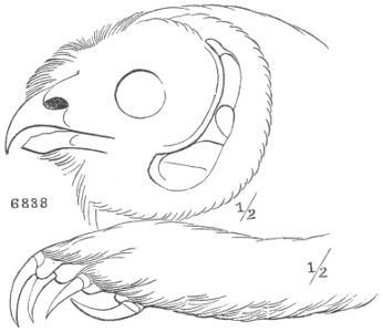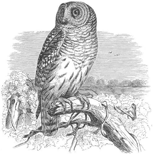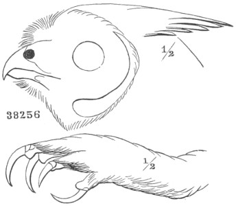 Char. Eyes directed forward, and surrounded by a radiating system of feathers, which is bounded, except anteriorly, by a ruff of stiff, compactly webbed, differently formed, and somewhat recurved feathers; loral feathers antrorse, long, and dense. Plumage very soft and lax, of a fine downy texture, the feathers destitute of an after-shaft. Oil-gland without the usual circlet of feathers. Outer webs of the quills with the points of the fibres recurved. Feathers on the sides of the forehead frequently elongated into ear-like tufts; tarsus usually, and toes frequently, densely feathered. Ear-opening very large, sometimes covered by a lappet. Œsophagus destitute of a dilated crop; cœca large. Maxillo-palatines thick and spongy, and encroaching upon the intervening valley; basipterygoid processes always present. Outer toe reversible; posterior toe only about half as long as the outer. Posterior margin of the sternum doubly indented; clavicle weak and nearly cylindrical, about equal in length to the sternum. Anterior process of the coracoid projected forward so as to meet the clavicle, beneath the basal process of the scapula. Eggs variable in shape, usually nearly spherical, always immaculate, pure white.