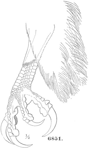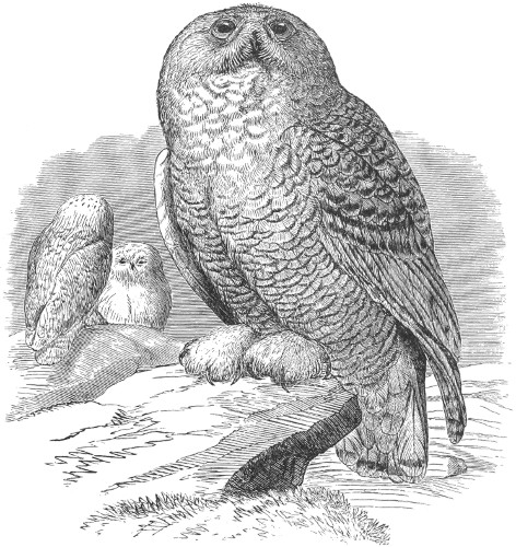 Ear-tufts rudimentary. Four outer quills with their inner webs emarginated; lower tail-coverts reaching end of the tail. Toes covered with long feathers, which hide the claws, and bill nearly concealed by the loral feathers … Nyctea.
