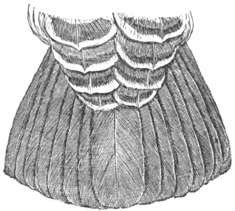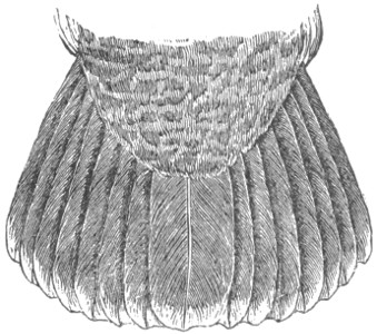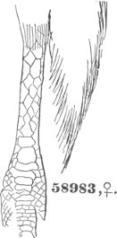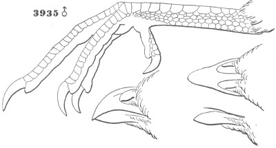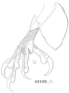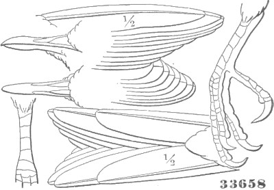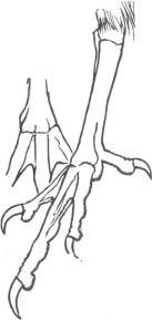 B. Inner toe decidedly or much shorter than the middle; inner edge of middle claw not pectinated. First quill shorter than the third; one to six outer quills with their inner webs emarginated. Tail rounded. Feathers of the posterior face of the tarsus not recurved but pointed downwards.