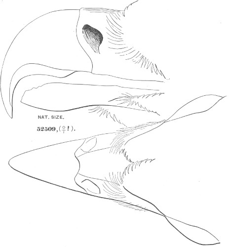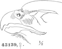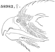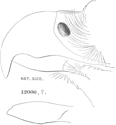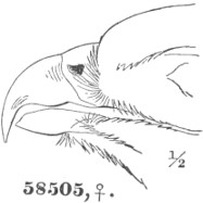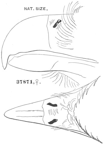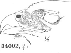 a. Cere, on top, equal to, or exceeding, the chord of the culmen; much arched. Ear-conch nearly as long as the height of the skull, with the operculum extending its full length; asymmetrical.