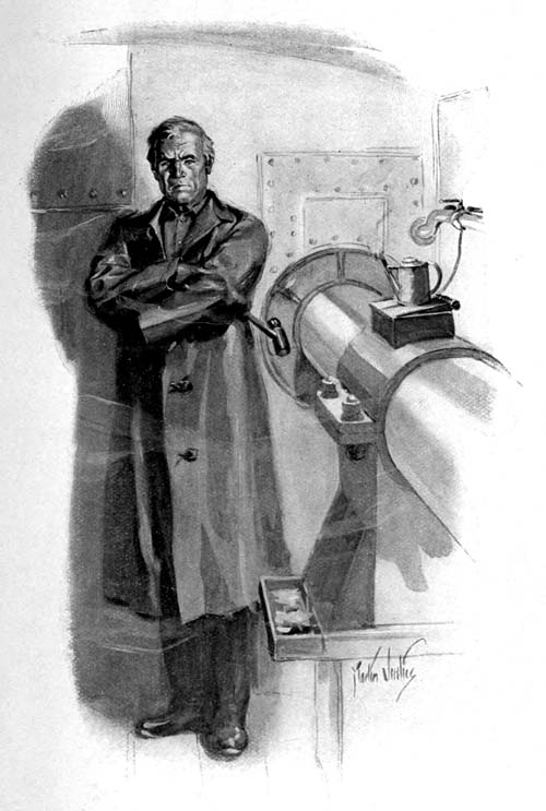 Captain Keighley, when he looked up to see Doherty above him, was standing on the cement roof of the Hudson’s wheelhouse, beside a monitor nozzle that could drive a hole through a brick wall with a stream as stiff as a steel bar; and the fact that he stood in this place of command by virtue of his own cunning, in spite of intrigue in the fire-department and treachery in his own crew, did not show in the look that he lifted to his[Pg 8] enemy overhead. At most he showed only a cool reliance on the streams of the Hudson to cope with any mischief that might be in hand; for the Hudson had a battery of four sets of duplex pumps that could force out of her pipes as much water in a minute as twenty shore-engines in a row; and Keighley was eager for a big fire to test her powers on.