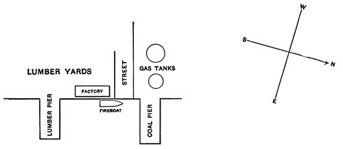 The men obeyed with alacrity, but by the time they got water through their hose, they had only a squirt-gun stream[Pg 13] to use against the fire that was developing inside the pierhouse’s corrugated sheet-iron shell. They could not see the extent of that fire; and Lieutenant Moore, grumbling and complaining, did not appreciate the fact that in the flames which began to strike out from the windows of the pierhouse through the smoke, there was more than the disgrace of Captain Keighley for blundering in his conduct of the attack.