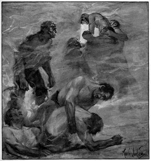 They were not half way up it before they met what they had met above the engine room—a suffocating heat and smother. The firemen heard the German growling and coughing above them, as big and clumsy as a bear that is being smoked out of a hollow tree. Captain Keighley caught up to him and shouted to him go on. He answered nothing that was intelligible, and tried to back down. Keighley ordered him to hold[Pg 27] fast, and went up over him like a cat.