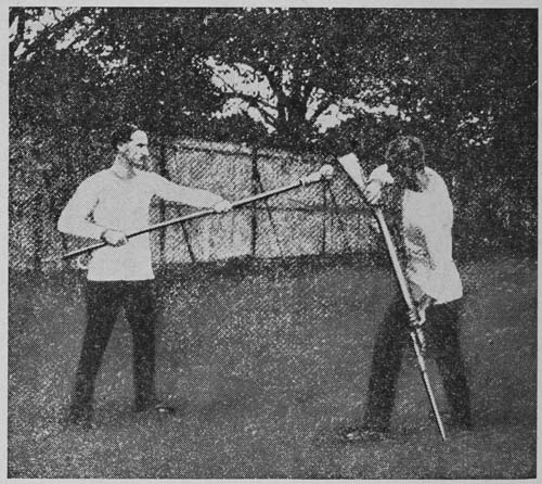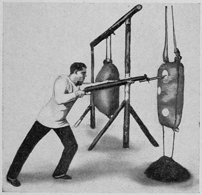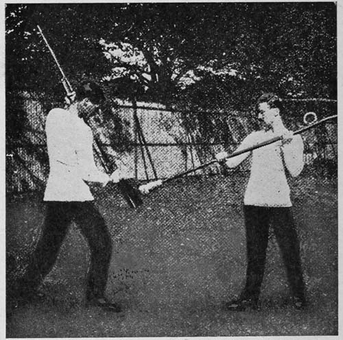 The class working in pairs, with the instructor supervising, should be practised in thrusting in various directions: (1) at the opposite man’s hand, which he places in various positions on and off his body; (2)[Pg 20] at thrusting rings, or balls of paper, tied to the end of sticks (see Plates VI, VII, VIII). This practice should be done without the word of command, so that the eye and brain may be trained.
