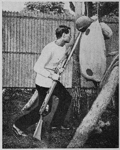 The greatest care should be taken that the object representing the opponent and its support should be incapable of injuring the bayonet or butt. Only light sticks (the parrying stick here referred to is shown in plates) must be used for parrying practice.