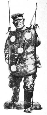 For practising direction, there must always be an aiming mark on the dummy. Cardboard discs for this purpose are desirable.[Pg 8] By continually changing the position of the mark, the “life” of the dummies is considerably prolonged.