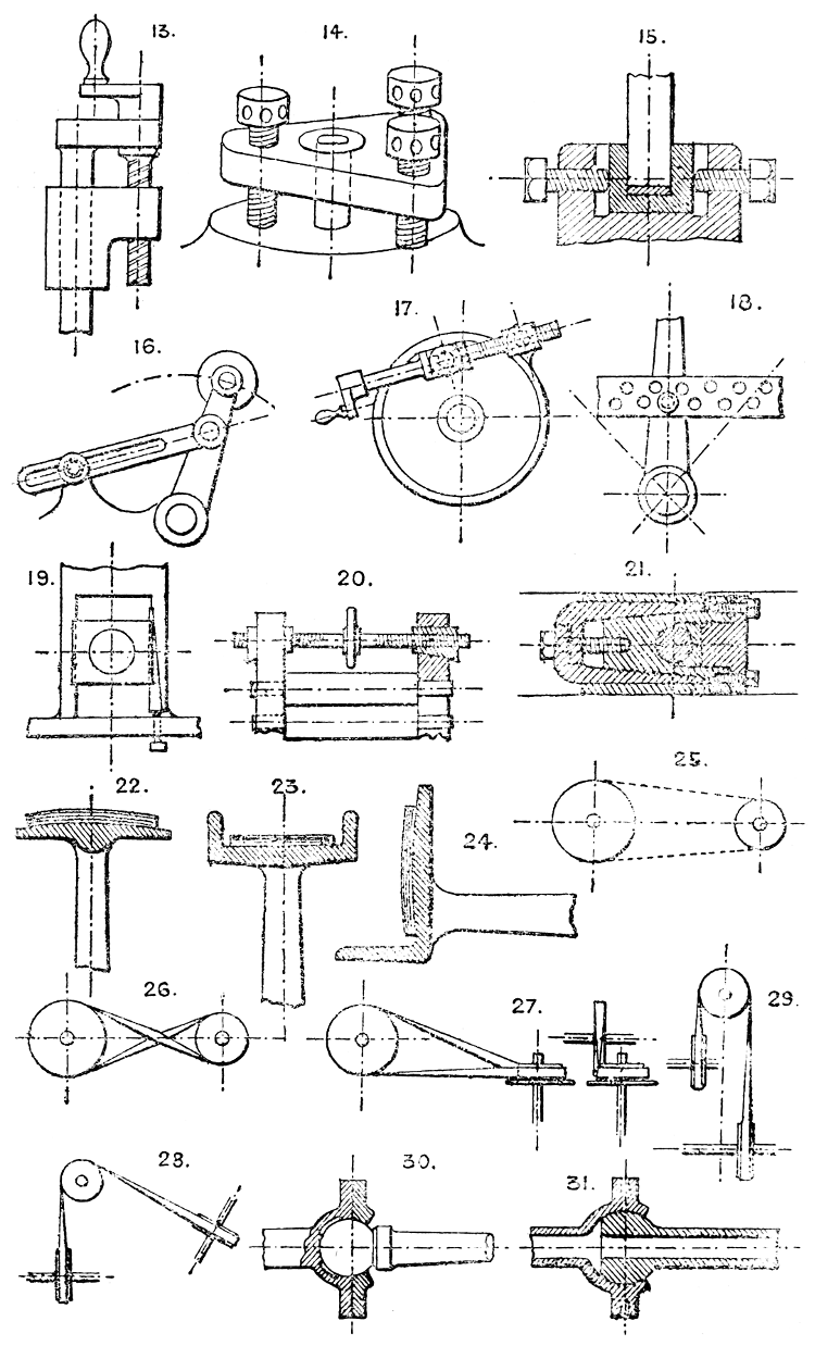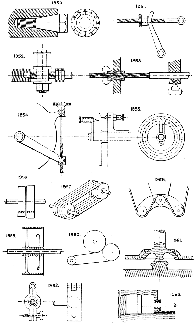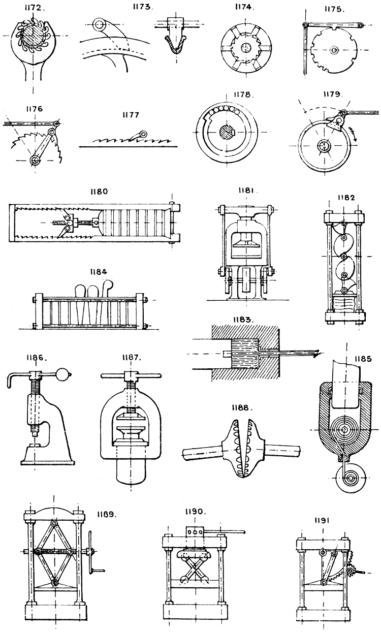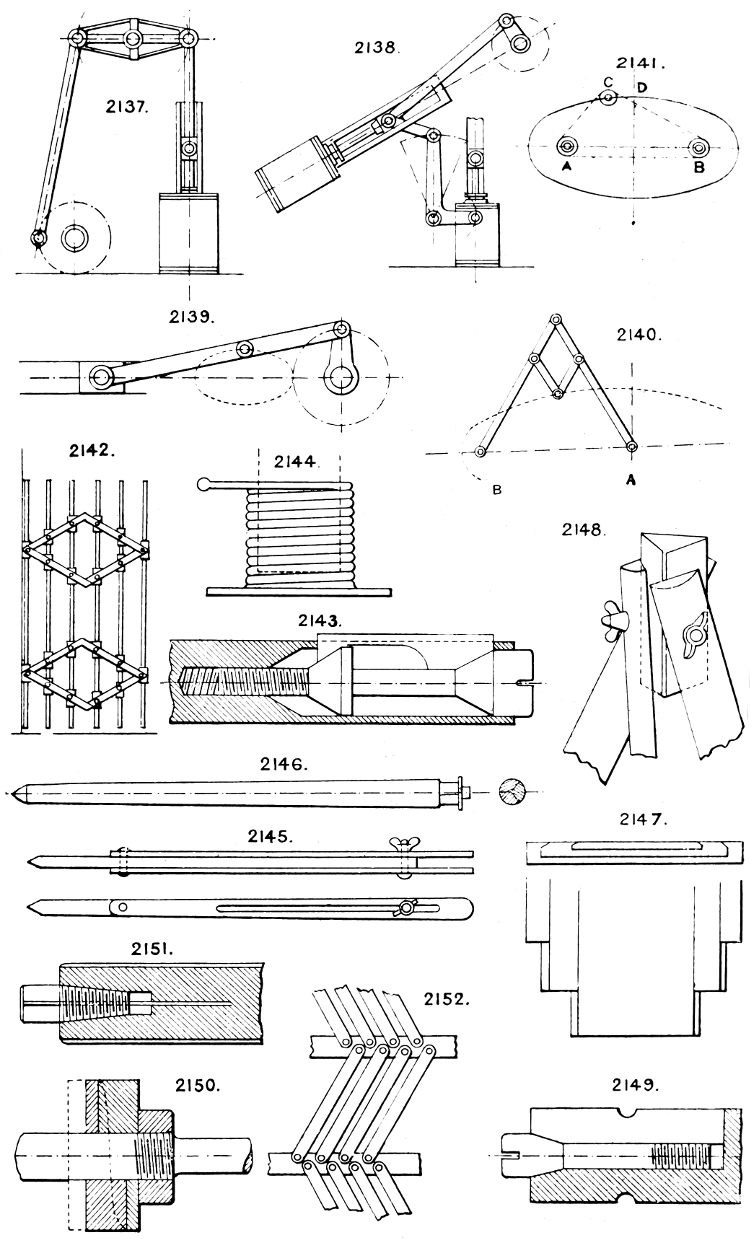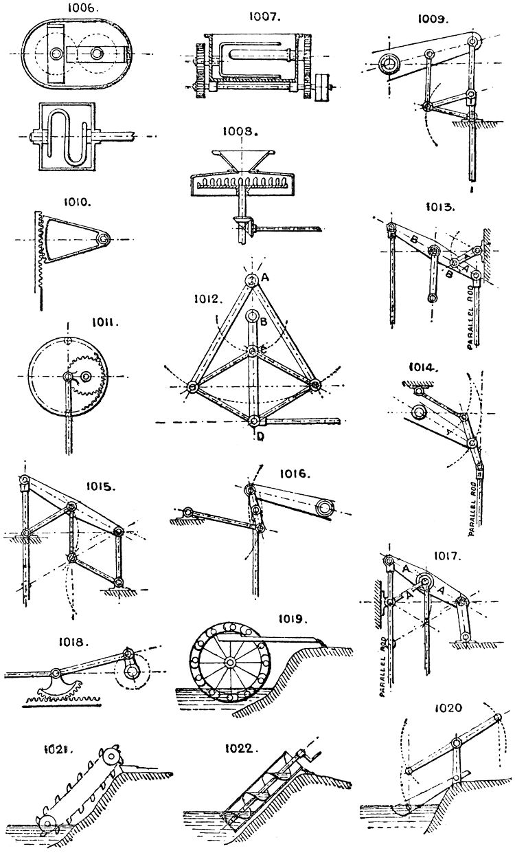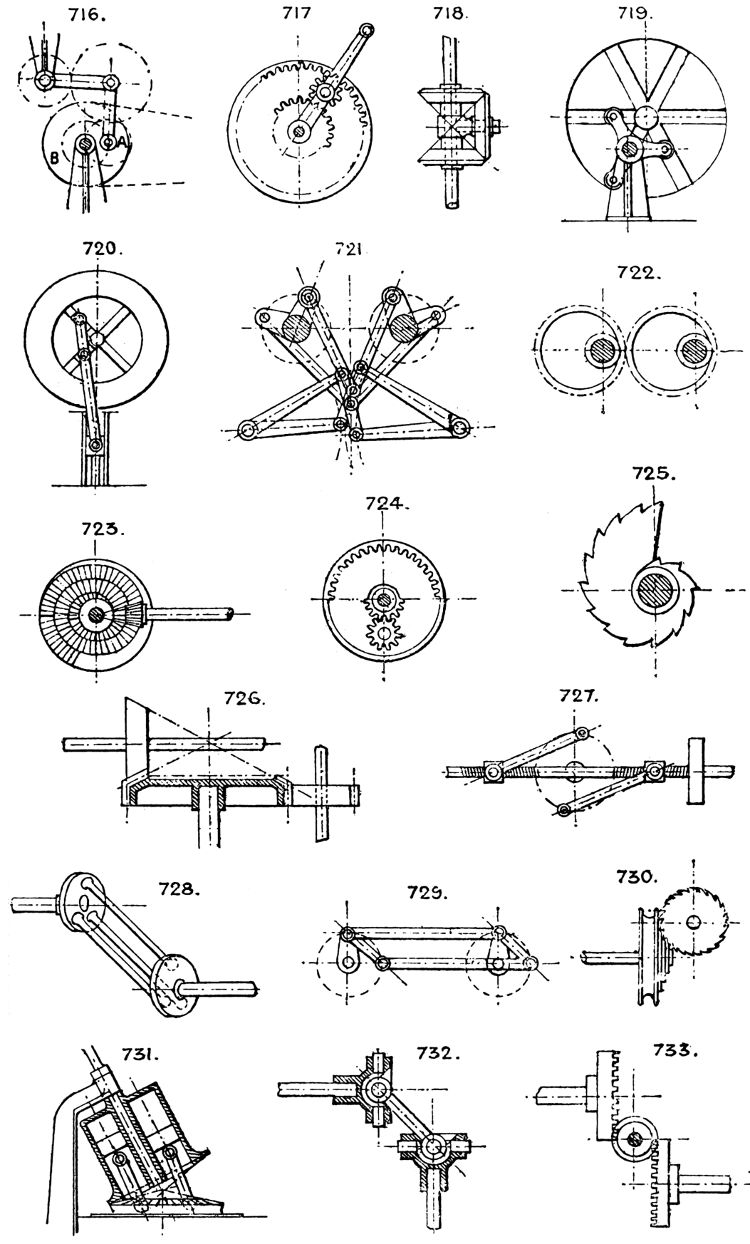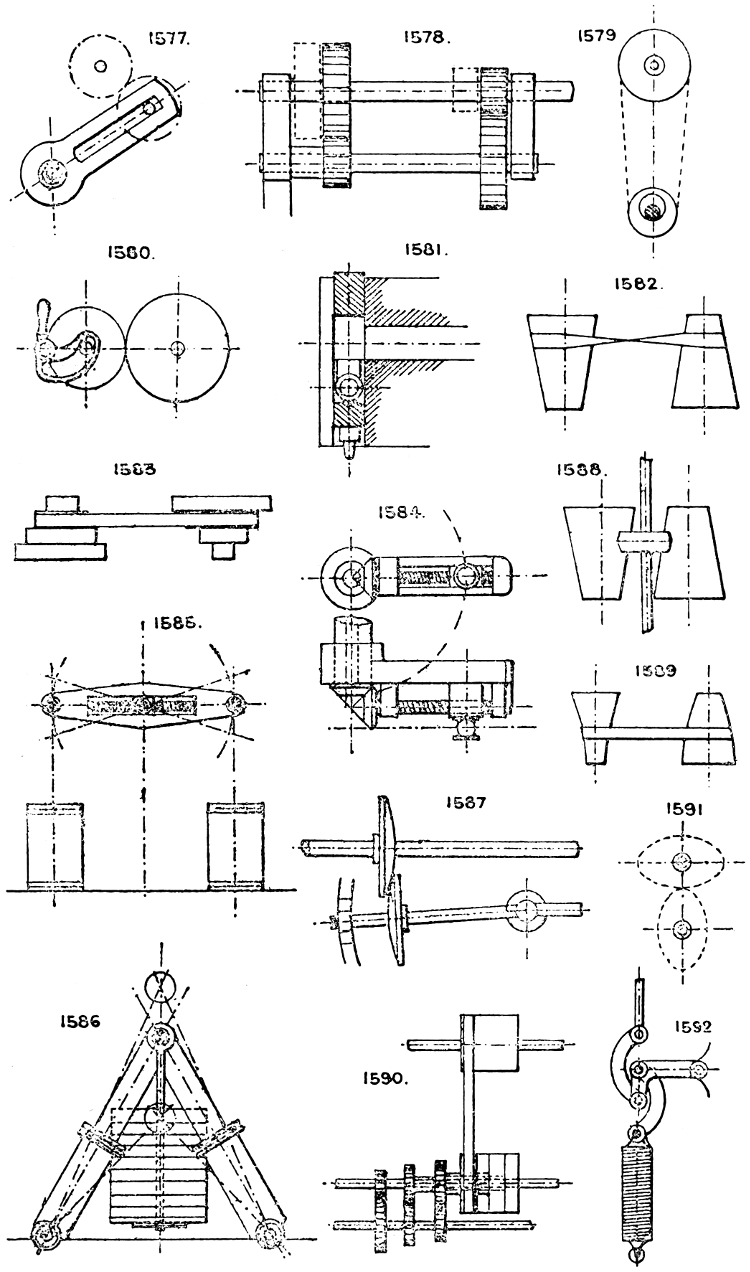 In the course of twenty-five years of such experience, I have found the want of such a volume as the present, and endeavoured to supply the deficiency in my own practice by private notes and sketches, gathered promiscuously, until the difficulty of selection and arrangement became so apparent that I began to classify them, as they exist in the following pages. A few weeks of unusual leisure have enabled me to complete this work and amplify it by numerous additions, and it is now presented in the hope that it will be found of equal service to others engaged in the head-splitting, exhausting work of scheming and devising machinery, than which I can conceive of no head-work more wearing and anxious, Several valuable works have already[vi] found numerous users, and there is no lack of admirable collections of memoranda, rules, and data for designing and proportioning the various constructive details of machinery; but, as far as I am aware, there is no work in existence which aims at the same purpose as is attempted in the following pages, viz. to provide side by side suggestive sketches of the various methods in use for accomplishing any particular mechanical movement or work, in a form easily referred to, and devoid of needless detail and elaboration. A sketch, properly executed, is—to a practical man—worth a folio of description; and it is to such that these pages are addressed. For the same reason it has been deemed undesirable to add to the various sketches any rules or tables relating to strengths or dimensions, which may be found in numerous well-known volumes.