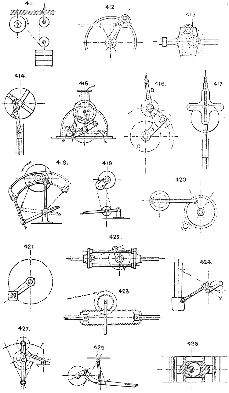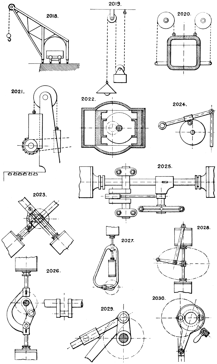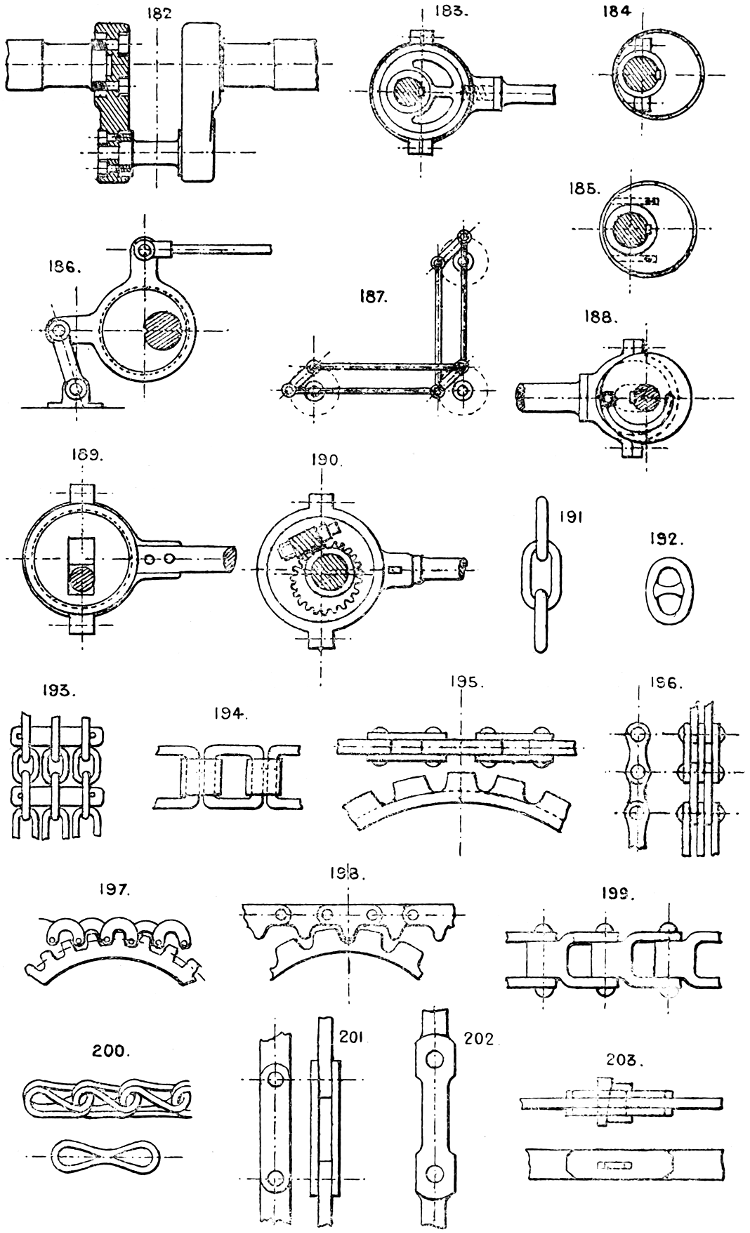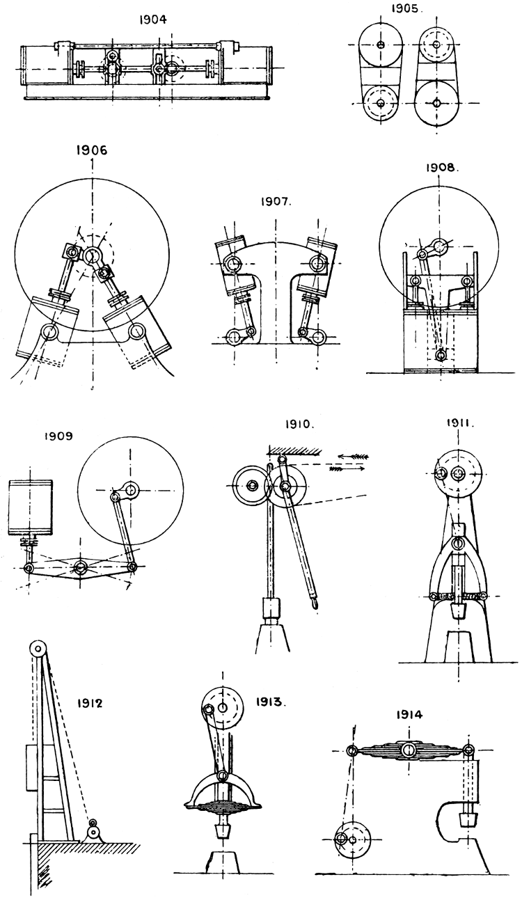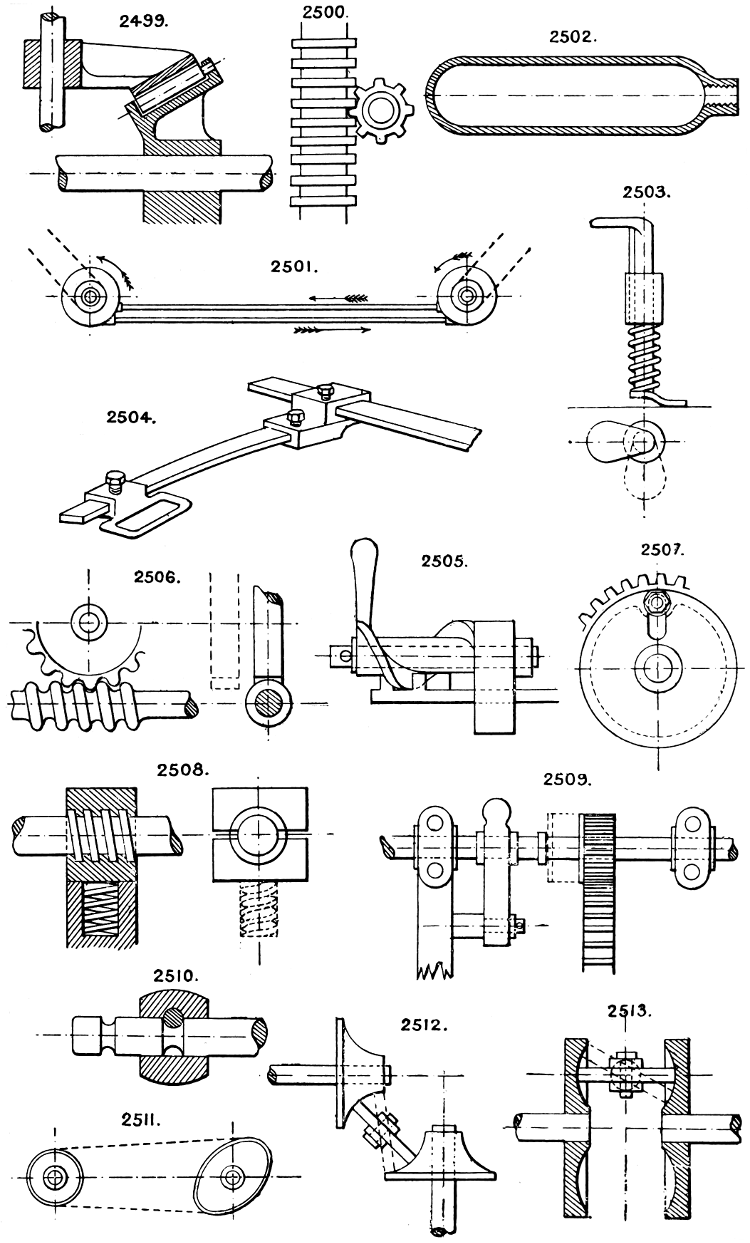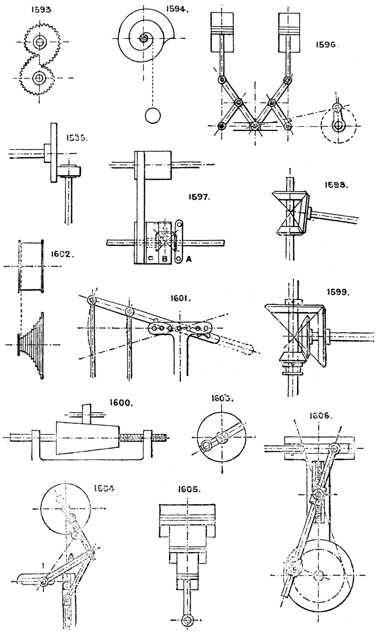 In the course of twenty-five years of such experience, I have found the want of such a volume as the present, and endeavoured to supply the deficiency in my own practice by private notes and sketches, gathered promiscuously, until the difficulty of selection and arrangement became so apparent that I began to classify them, as they exist in the following pages. A few weeks of unusual leisure have enabled me to complete this work and amplify it by numerous additions, and it is now presented in the hope that it will be found of equal service to others engaged in the head-splitting, exhausting work of scheming and devising machinery, than which I can conceive of no head-work more wearing and anxious, Several valuable works have already[vi] found numerous users, and there is no lack of admirable collections of memoranda, rules, and data for designing and proportioning the various constructive details of machinery; but, as far as I am aware, there is no work in existence which aims at the same purpose as is attempted in the following pages, viz. to provide side by side suggestive sketches of the various methods in use for accomplishing any particular mechanical movement or work, in a form easily referred to, and devoid of needless detail and elaboration. A sketch, properly executed, is—to a practical man—worth a folio of description; and it is to such that these pages are addressed. For the same reason it has been deemed undesirable to add to the various sketches any rules or tables relating to strengths or dimensions, which may be found in numerous well-known volumes.