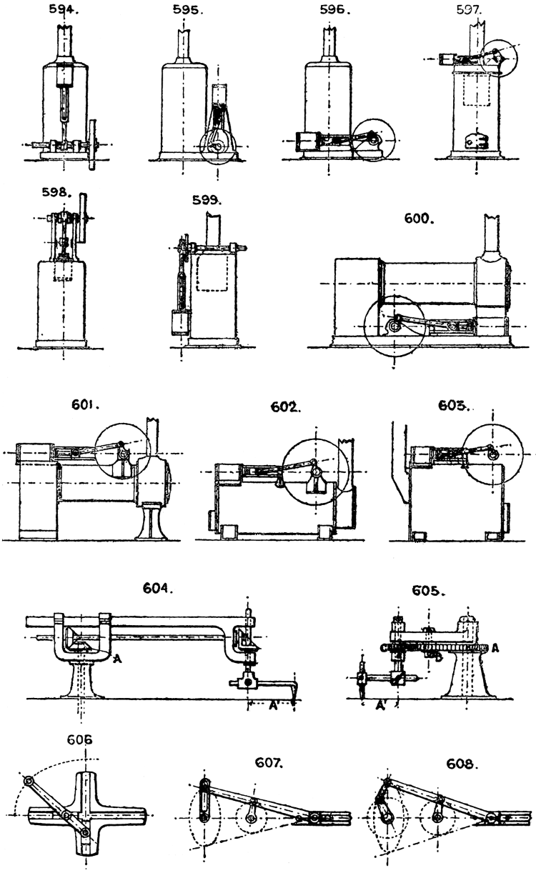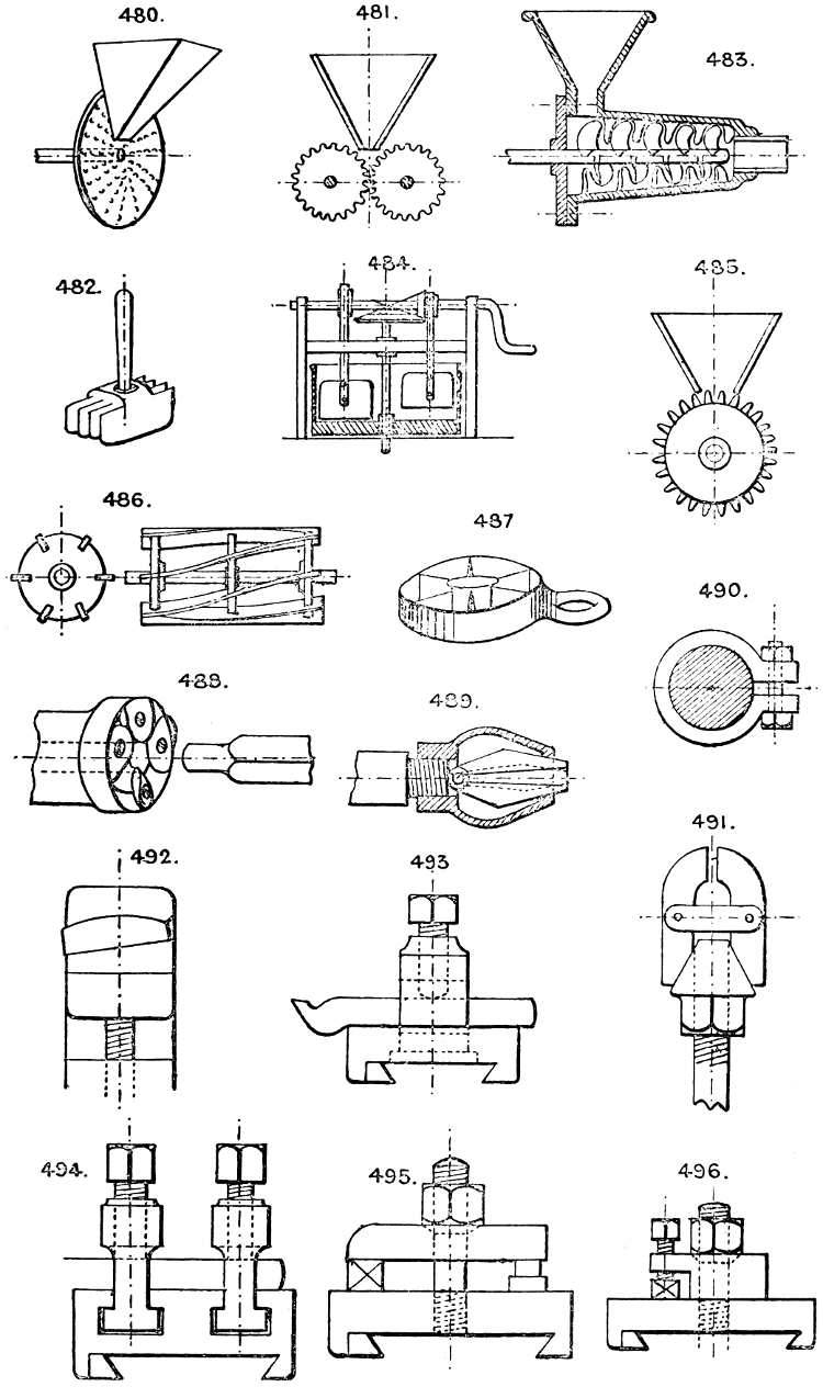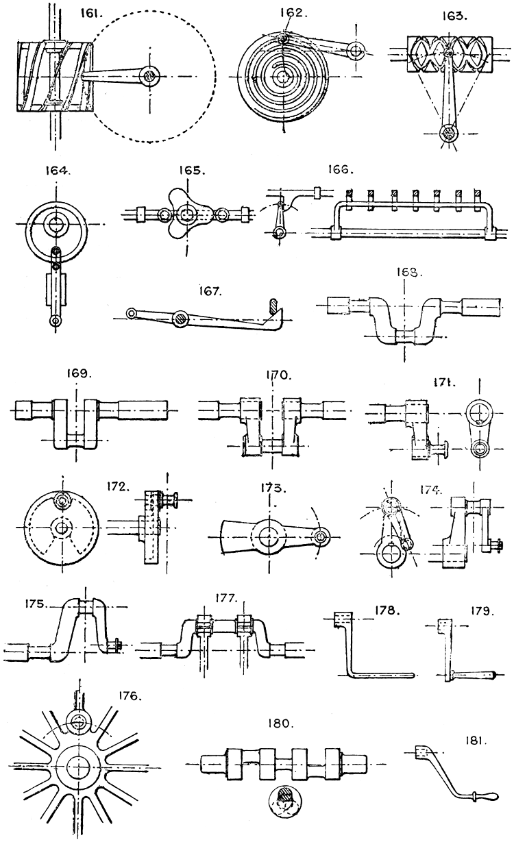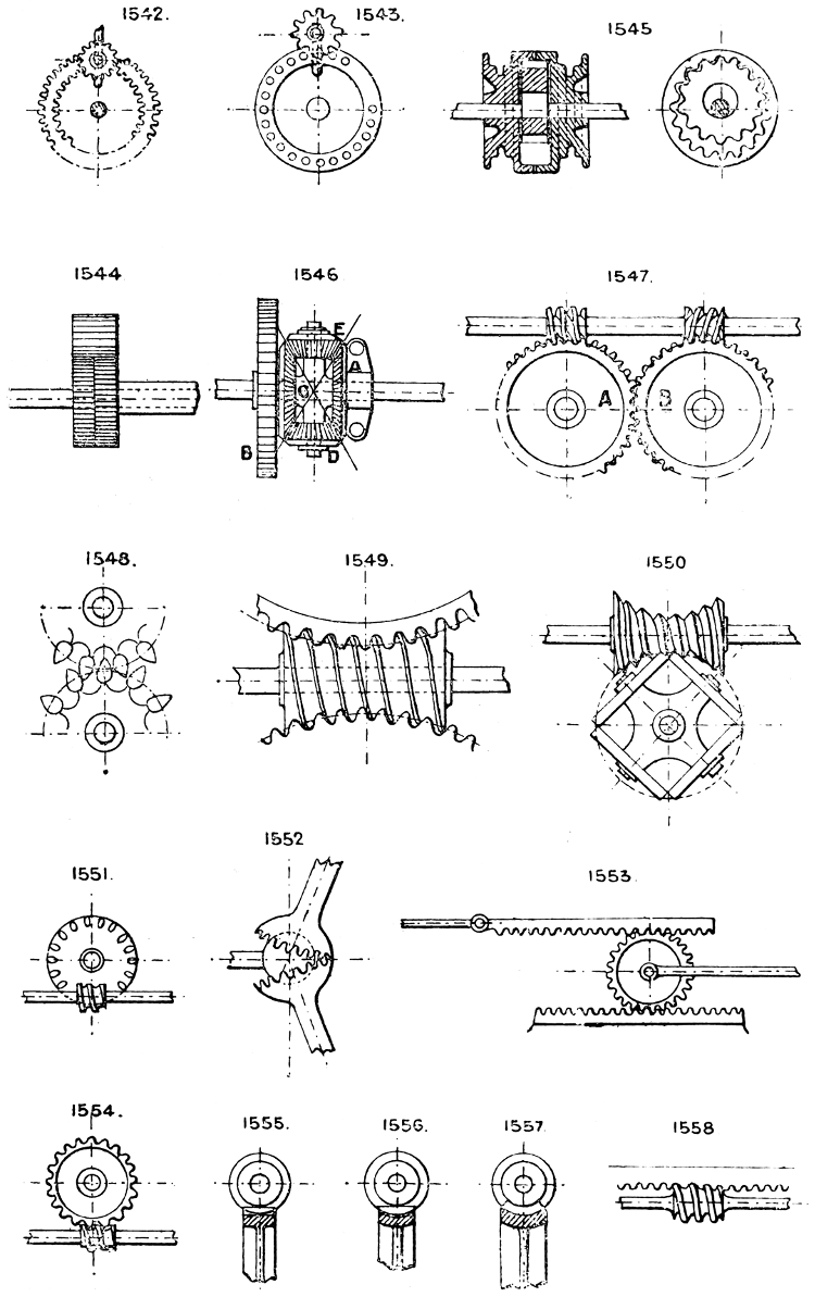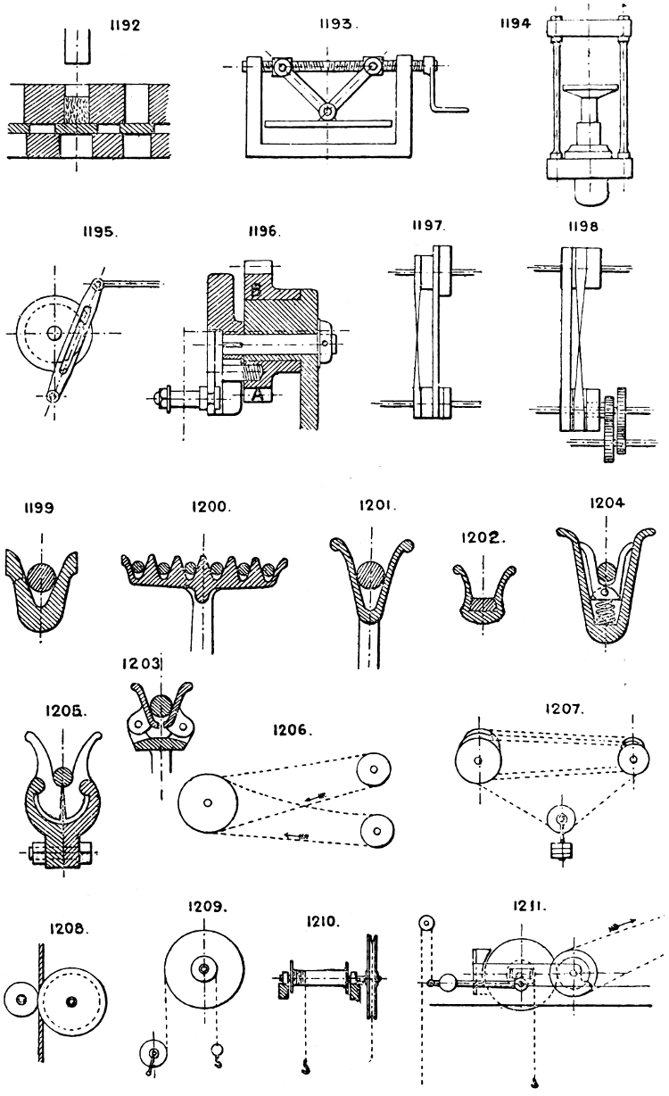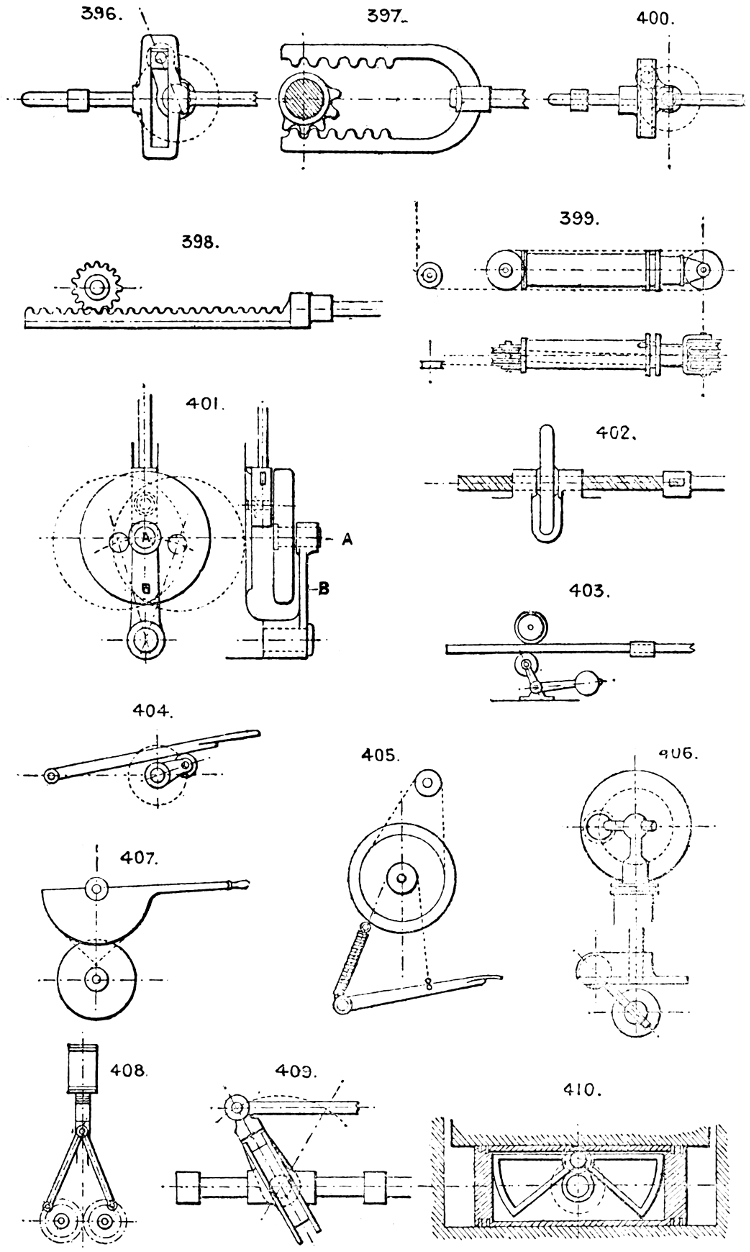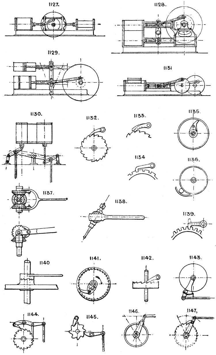 In the course of twenty-five years of such experience, I have found the want of such a volume as the present, and endeavoured to supply the deficiency in my own practice by private notes and sketches, gathered promiscuously, until the difficulty of selection and arrangement became so apparent that I began to classify them, as they exist in the following pages. A few weeks of unusual leisure have enabled me to complete this work and amplify it by numerous additions, and it is now presented in the hope that it will be found of equal service to others engaged in the head-splitting, exhausting work of scheming and devising machinery, than which I can conceive of no head-work more wearing and anxious, Several valuable works have already[vi] found numerous users, and there is no lack of admirable collections of memoranda, rules, and data for designing and proportioning the various constructive details of machinery; but, as far as I am aware, there is no work in existence which aims at the same purpose as is attempted in the following pages, viz. to provide side by side suggestive sketches of the various methods in use for accomplishing any particular mechanical movement or work, in a form easily referred to, and devoid of needless detail and elaboration. A sketch, properly executed, is—to a practical man—worth a folio of description; and it is to such that these pages are addressed. For the same reason it has been deemed undesirable to add to the various sketches any rules or tables relating to strengths or dimensions, which may be found in numerous well-known volumes.
