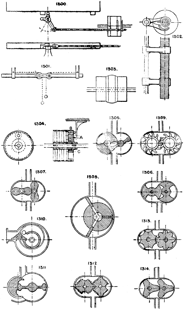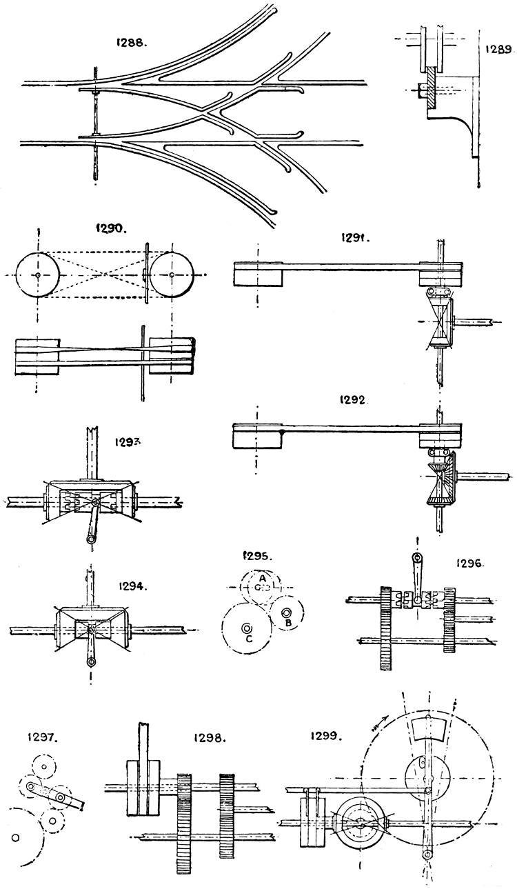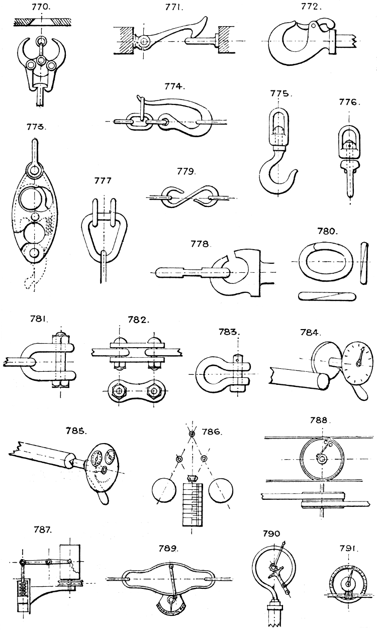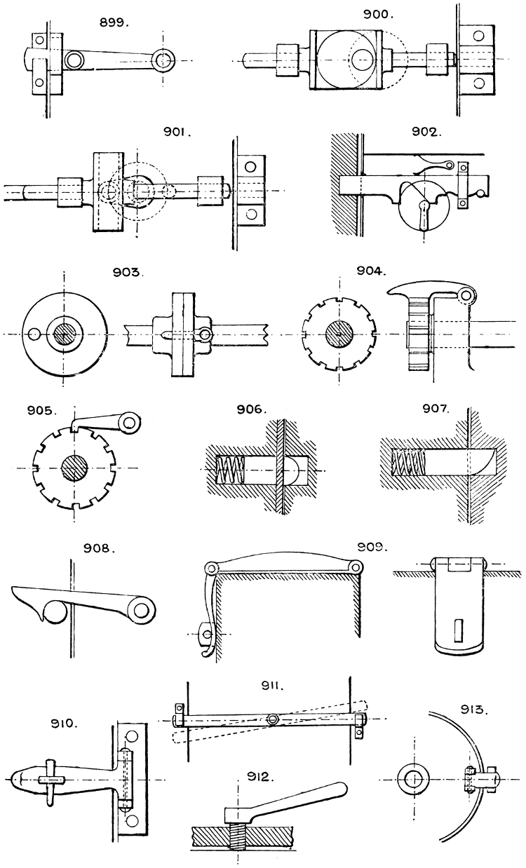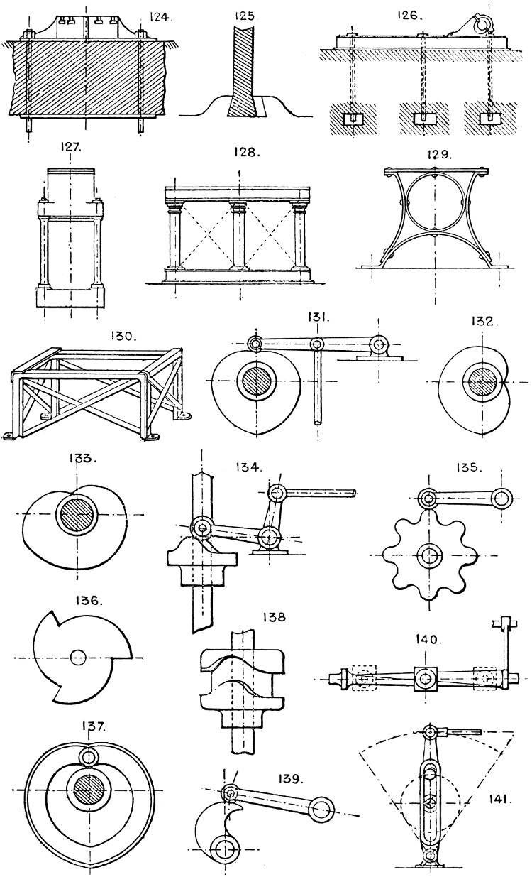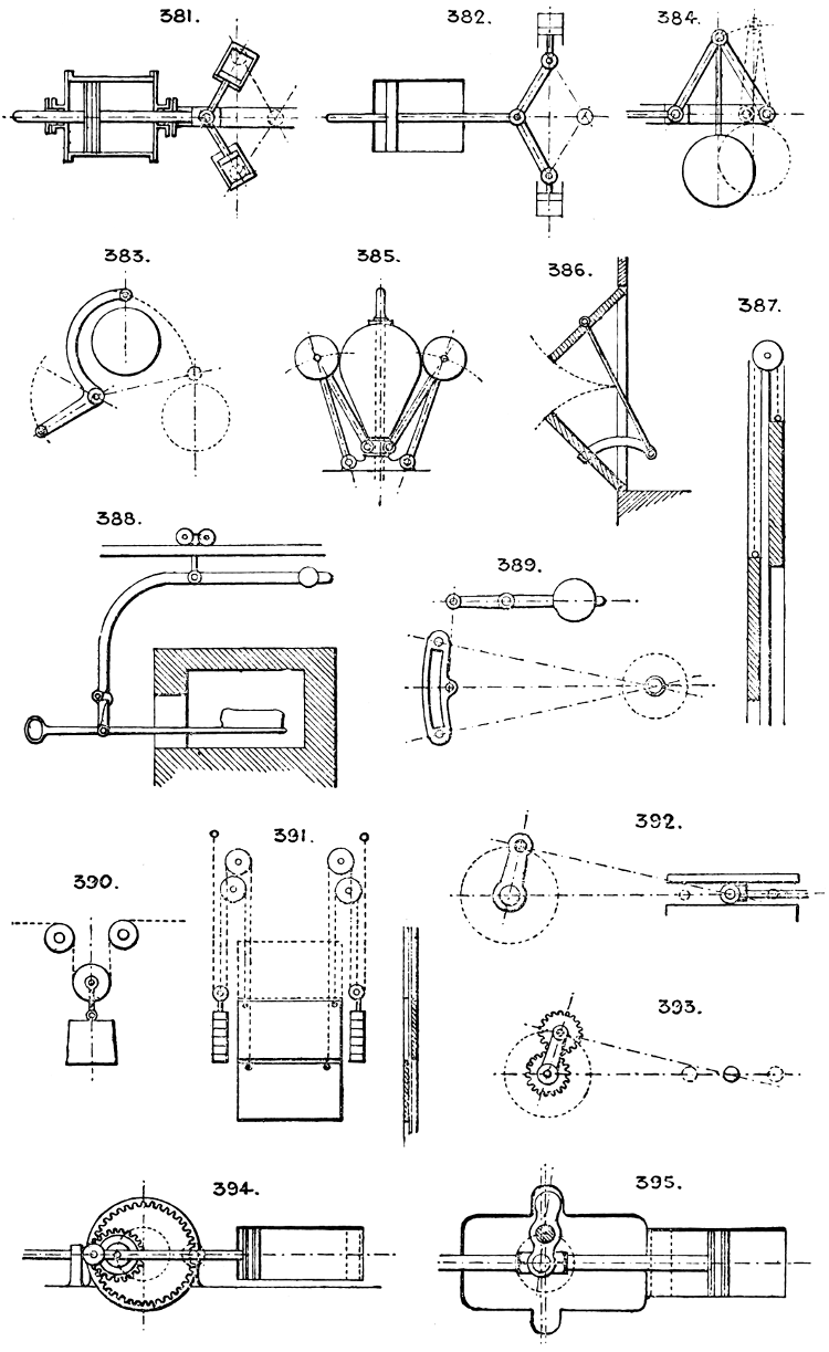 In the course of twenty-five years of such experience, I have found the want of such a volume as the present, and endeavoured to supply the deficiency in my own practice by private notes and sketches, gathered promiscuously, until the difficulty of selection and arrangement became so apparent that I began to classify them, as they exist in the following pages. A few weeks of unusual leisure have enabled me to complete this work and amplify it by numerous additions, and it is now presented in the hope that it will be found of equal service to others engaged in the head-splitting, exhausting work of scheming and devising machinery, than which I can conceive of no head-work more wearing and anxious, Several valuable works have already[vi] found numerous users, and there is no lack of admirable collections of memoranda, rules, and data for designing and proportioning the various constructive details of machinery; but, as far as I am aware, there is no work in existence which aims at the same purpose as is attempted in the following pages, viz. to provide side by side suggestive sketches of the various methods in use for accomplishing any particular mechanical movement or work, in a form easily referred to, and devoid of needless detail and elaboration. A sketch, properly executed, is—to a practical man—worth a folio of description; and it is to such that these pages are addressed. For the same reason it has been deemed undesirable to add to the various sketches any rules or tables relating to strengths or dimensions, which may be found in numerous well-known volumes.