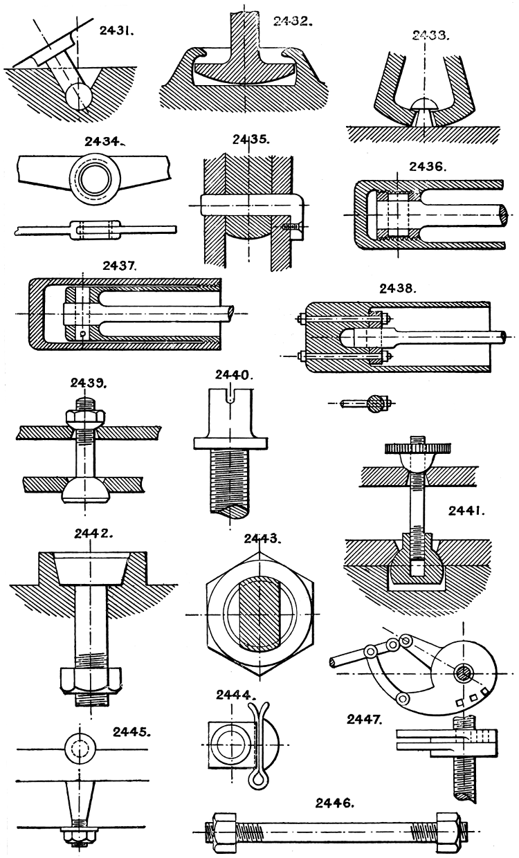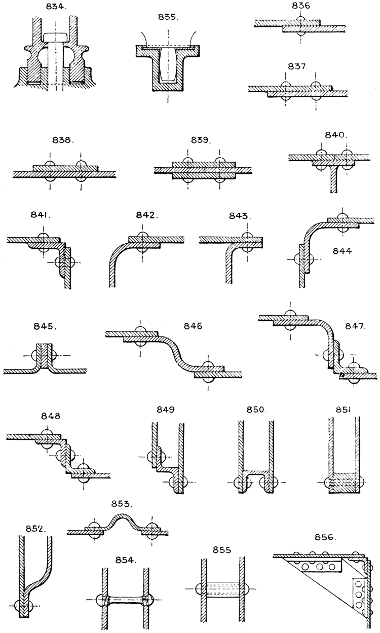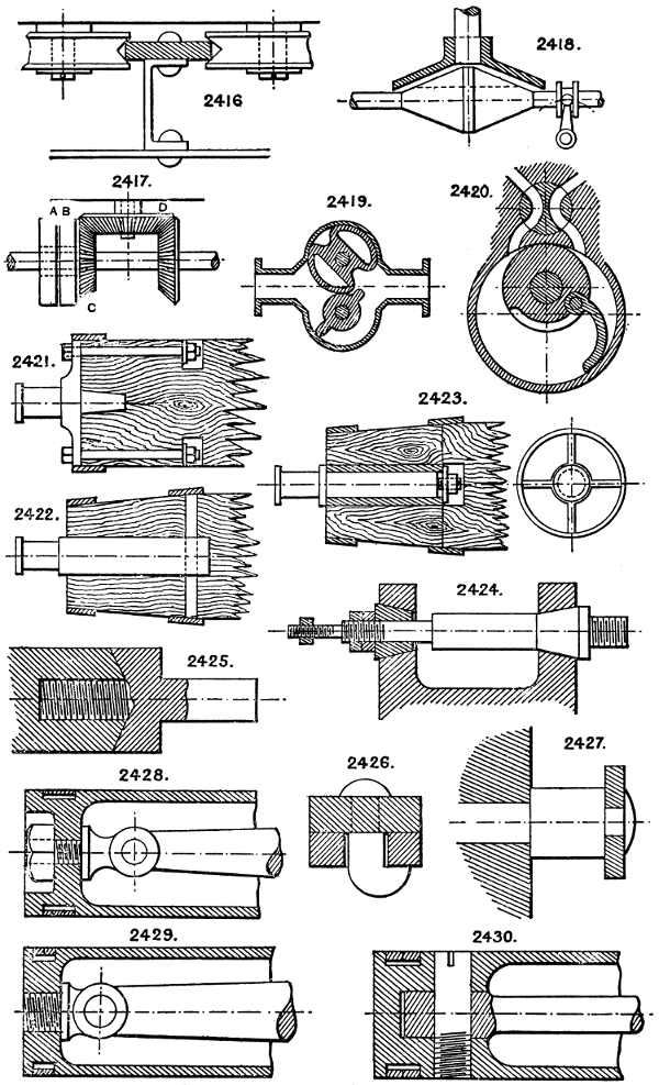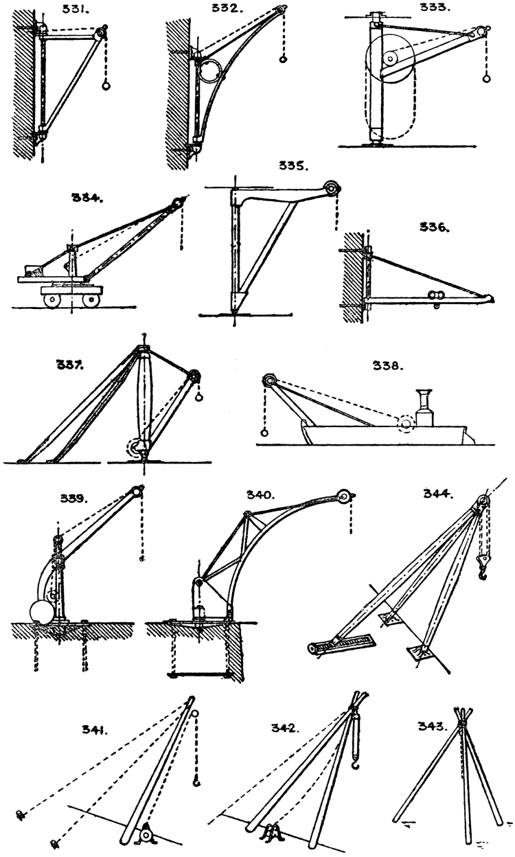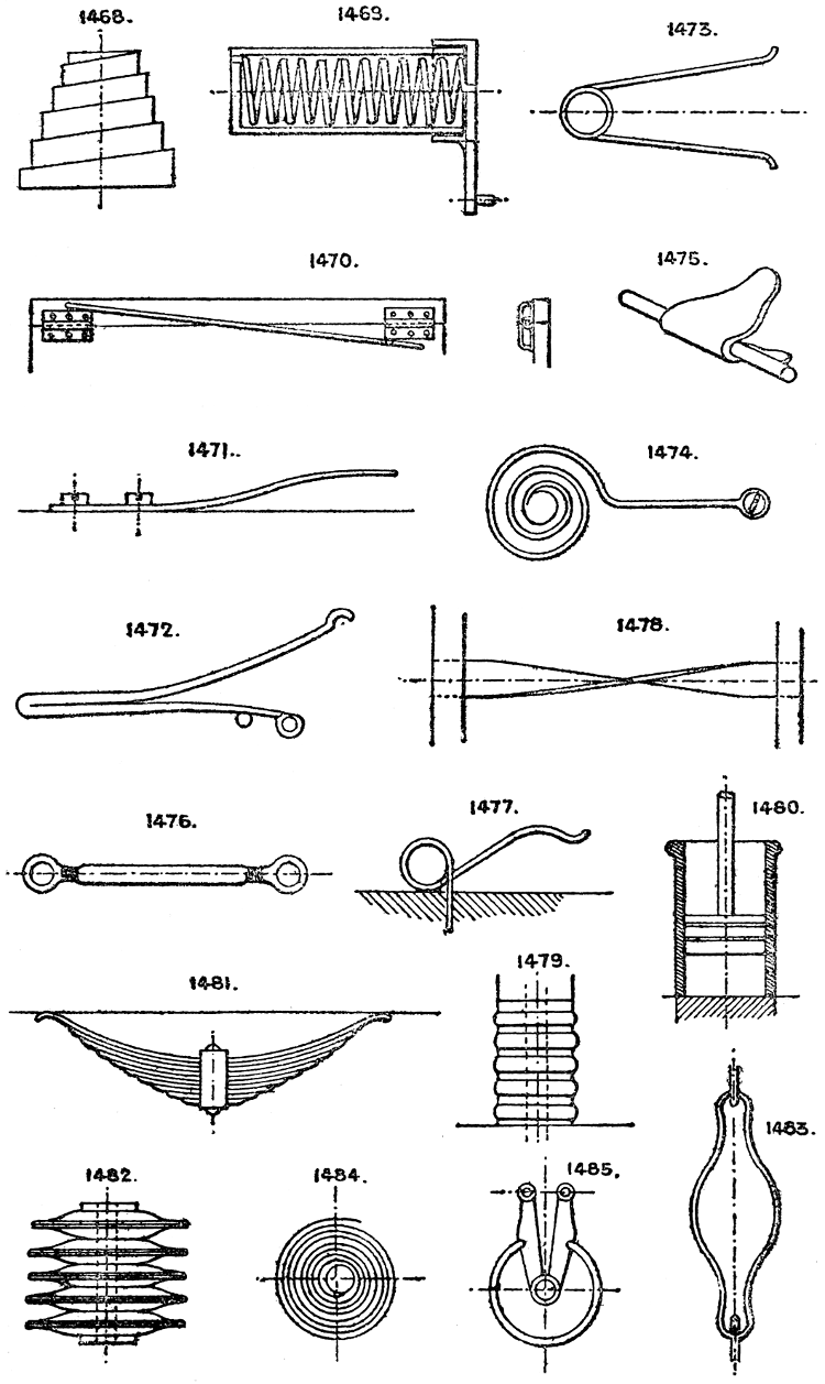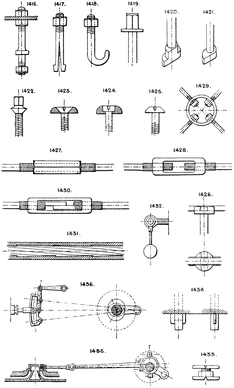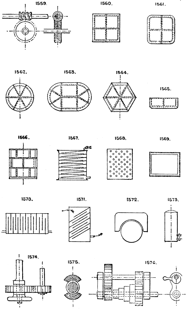 In the course of twenty-five years of such experience, I have found the want of such a volume as the present, and endeavoured to supply the deficiency in my own practice by private notes and sketches, gathered promiscuously, until the difficulty of selection and arrangement became so apparent that I began to classify them, as they exist in the following pages. A few weeks of unusual leisure have enabled me to complete this work and amplify it by numerous additions, and it is now presented in the hope that it will be found of equal service to others engaged in the head-splitting, exhausting work of scheming and devising machinery, than which I can conceive of no head-work more wearing and anxious, Several valuable works have already[vi] found numerous users, and there is no lack of admirable collections of memoranda, rules, and data for designing and proportioning the various constructive details of machinery; but, as far as I am aware, there is no work in existence which aims at the same purpose as is attempted in the following pages, viz. to provide side by side suggestive sketches of the various methods in use for accomplishing any particular mechanical movement or work, in a form easily referred to, and devoid of needless detail and elaboration. A sketch, properly executed, is—to a practical man—worth a folio of description; and it is to such that these pages are addressed. For the same reason it has been deemed undesirable to add to the various sketches any rules or tables relating to strengths or dimensions, which may be found in numerous well-known volumes.