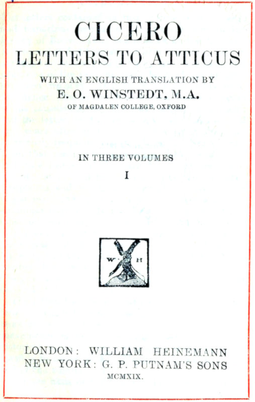The letters contained in this volume cover a large and important period in Cicero’s life and in the history of Rome. They begin when he was 38 years of age; and at first they are not very numerous. There are only two of that year (68 B.C.), six of the following year, one of the year 66, when he held the praetorship, and two of 65. Then there is a gap in his correspondence. No letters at all survive from the period of his consulship and the Catilinarian conspiracy; and the letters to Atticus do not begin again until two years after that event. Thereafter they are sufficiently frequent to justify Cornelius Nepos’ criticism, that reading them, one has little need of an elaborate history of the period. There are full—almost too full—details, considering the frequent complaints and repetitions, during the year of his banishment (58–57 B.C.), and the correspondence continues unbroken to the year 54. Then after a lapse of two years or more, which Atticus presumably spent in Rome, it begins again in 51, when Cicero was sent to Cilicia as pro-consul, much against his will; and the volume ends with a hint of the trouble that was brewing between Caesar and Pompey, as Cicero was returning to Rome towards the end of the next year.