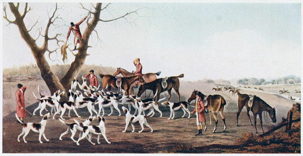 After reading “Pytchly’s Story” it is impossible to believe that Mr. Smith did not appreciate and act upon the moral that it points, but actually went to the other extreme of trying to hunt the Fox himself regardless of his Hounds. Yet Nimrod in his “Hunting Reminiscences” would have us believe that he did. After characteristically beginning his appreciation of Mr. Smith by describing his horsemanship, he then goes on to say that as a Huntsman he was wild, and that there was too much of the man, and too little of the Hounds to satisfy a lover of hunting. He would go away, says Nimrod, with the leading Hounds, caring nothing for the body of the pack, with his eye “forward to some point which his intuitive knowledge of the line Foxes take induced him to believe his had taken; and six times in ten he was right.” Frankly, but with great respect to Nimrod, we do not believe it; and it should be remarked that even Nimrod himself only credits Mr. Smith with six correct flashes of intuition in every ten attempts. Invaluable as are the writings of “Pomponius Ego” as “costume pieces,” even as historical references, it is open to doubt if he was really a reliable critic of the Huntsman’s Art. He certainly makes Mr. Osbaldiston do some queer things in his imaginary description of a day with the Quorn Hounds in 1826, such, for instance, as view-holloaing with his finger in his ear before a single Hound had opened in covert. But we will let that pass.