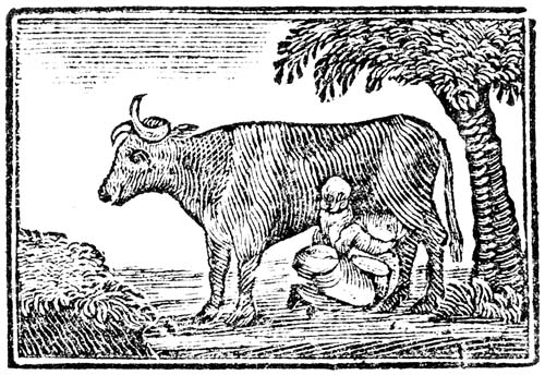 This is the good-natured Cow to which we are all so much obliged. She comes, poor thing! in the morning, and brings her udder full of milk for[10] our breakfast, and the same at night for our supper. To her we are indebted for our custards, cheesecakes, curds and cream, as well as for our milk, butter, and cheese.