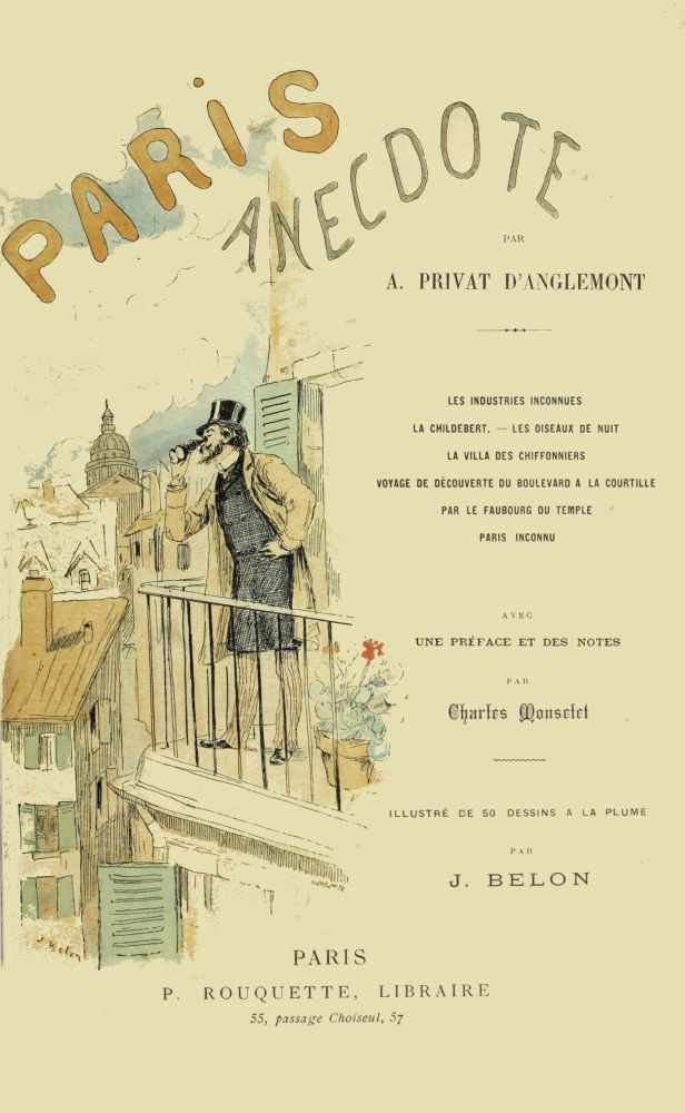 Privat n’avait qu’un volume dans le ventre, mais ce volume lui survivra; il a déjà la valeur des chapitres de Saint-Foix et de Mercier, car la plupart des quartiers et des mœurs qu’il décrit ont disparu.