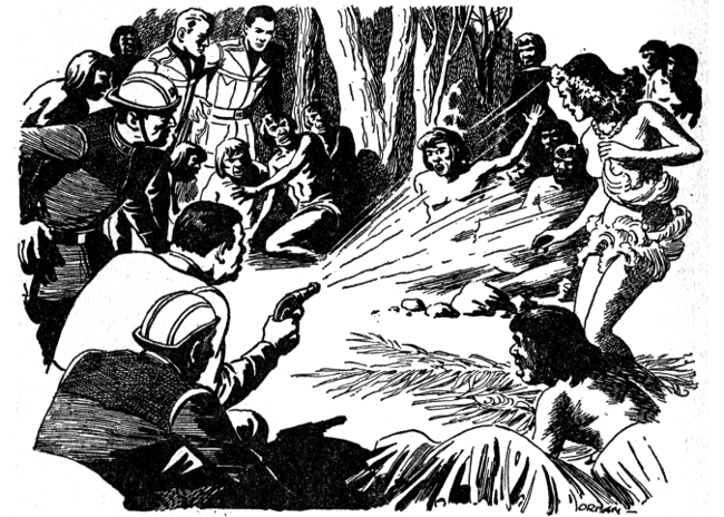 Koven stood at the window of Spotwood's shack, which looked down a long street to the central clearing which formed the crossroads of Maru. Bluish sky spread out overhead like sheets of hot metal, and the almost poisonously colorful foliage stuttered gently in a hot breeze. The nearly undressed inhabitants, skins belying only a touch of the bluish blood from Mars, idled along from hut to hut, talking or playing with the children. The only note of turmoil was sounded by the slapping skin drums from the far side of the village. Koven turned around to his host.