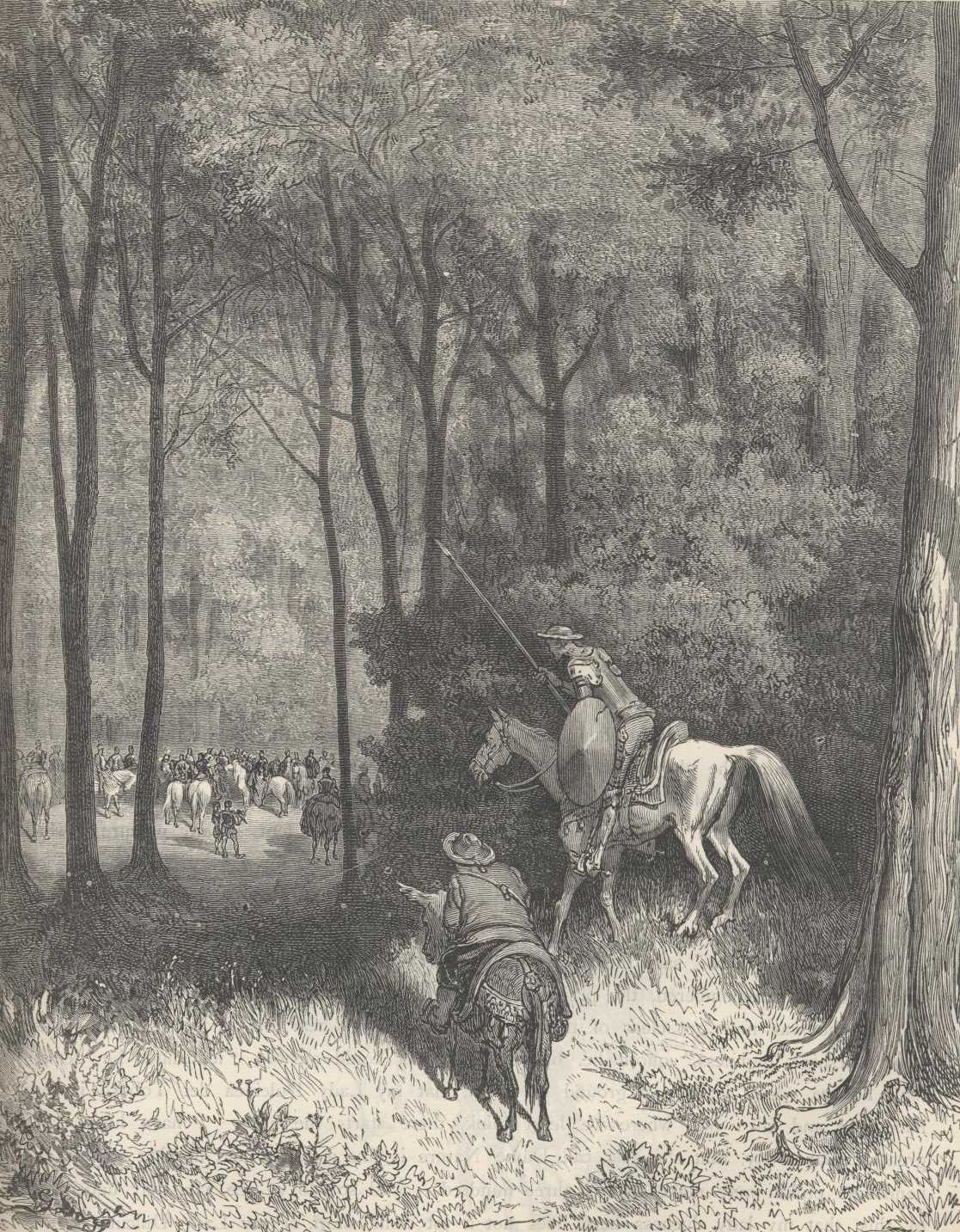 As Sancho said this, he tied the beasts, leaving them to the care and protection of the enchanters with sorrow enough in his heart. Don Quixote bade him not be uneasy about deserting the animals, "for he who would carry themselves over such longinquous roads and regions would take care to feed them."