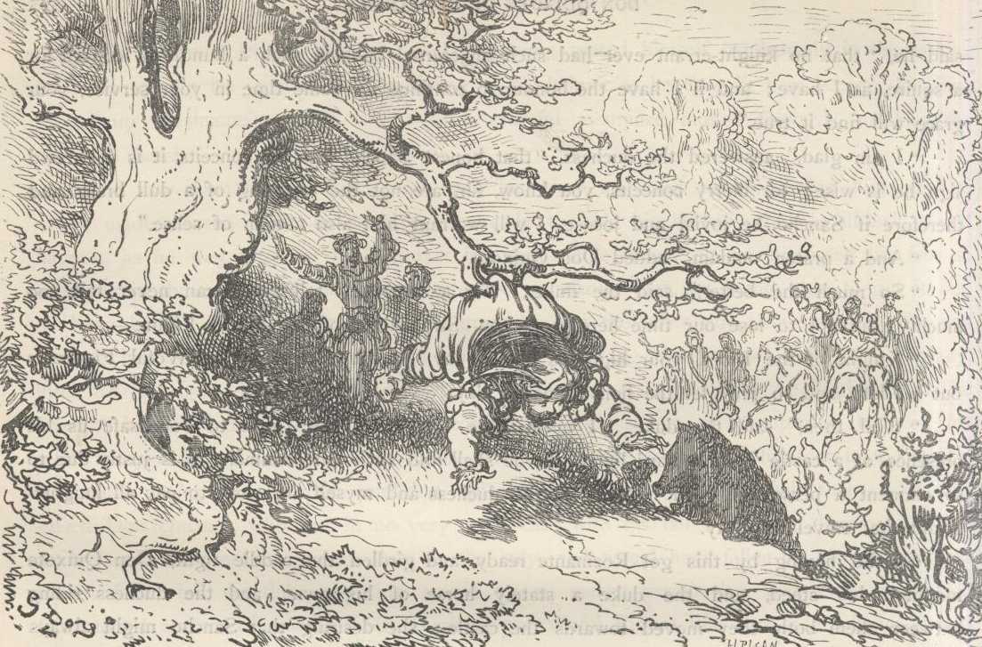 Don Quixote now came up with his visor raised, and as he seemed about to dismount Sancho made haste to go and hold his stirrup for him; but in getting down off Dapple he was so unlucky as to hitch his foot in one of the ropes of the pack-saddle in such a way that he was unable to free it, and was left hanging by it with his face and breast on the ground. Don Quixote, who was not used to dismount without having the stirrup held, fancying that Sancho had by this time come to hold it for him, threw himself off with a lurch and brought Rocinante's saddle after him, which was no doubt badly girthed, and saddle and he both came to the ground; not without discomfiture to him and abundant curses muttered between his teeth against the unlucky Sancho, who had his foot still in the shackles. The duke ordered his huntsmen to go to the help of knight and squire, and they raised Don Quixote, sorely shaken by his fall; and he, limping, advanced as best he could to kneel before the noble pair. This, however, the duke would by no means permit; on the contrary, dismounting from his horse, he went and embraced Don Quixote, saying, "I am grieved, Sir Knight of the Rueful Countenance, that your first experience on my ground should have been such an unfortunate one as we have seen; but the carelessness of squires is often the cause of worse accidents."