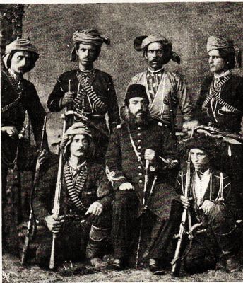 "Remingtons!" exclaimed the chief, as the advance-guard cautiously halted in the wide circle which it had mapped out for itself. "A local guerilla force!" And raising himself in his stirrups, the grizzly chief turned to his men, and flourishing his long blade, shouted: "Scatter out! Advance, and let them have it!"
