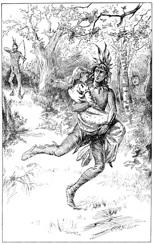 The Indian muttered something in his own tongue that was hardly complimentary to the whites. While Patience was trying to get up her courage to make the difficult spring back toward the land, the canoe had been concealed under some bushes, for Ranteo did not feel quite sure the whites were to be trusted; if so, why should this child come to warn him? He thought of all this as he drew his canoe up on land and hid it. He was standing, holding his hand out to Patience before she had gained courage enough to move. She took his hand and tried to jump, but the fright that had lent her[35] strength was over now, and she was trembling and unsteady. Ranteo drew her to the rock on which he stood, then, raising her to his shoulder, stepped across to the land. He did not put her down, but turned into the unbroken forest by a path or trail which his Indian eye had traced.