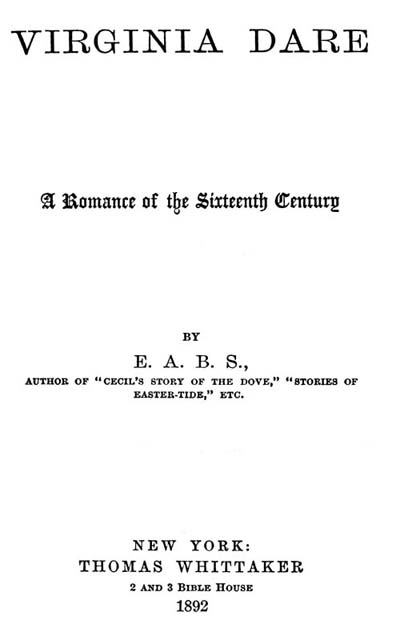 The Project Gutenberg EBook of Virginia Dare: A Romance of the Sixteenth Century, by E. A. B. Shackleford This eBook is for the use of anyone anywhere in the United States and most other parts of the world at no cost and with almost no restrictions whatsoever. You may copy it, give it away or re-use it under the terms of the Project Gutenberg License included with this eBook or online at www.gutenberg.org. If you are not located in the United States, you'll have to check the laws of the country where you are located before using this ebook. Title: Virginia Dare: A Romance of the Sixteenth Century Author: E. A. B. Shackleford Release Date: September 3, 2019 [EBook #60231] Language: English Character set encoding: ASCII *** START OF THIS PROJECT GUTENBERG EBOOK VIRGINIA DARE *** Produced by Melissa McDaniel, David E. Brown, and the Online Distributed Proofreading Team at http://www.pgdp.net (This file was produced from images generously made available by The Internet Archive)