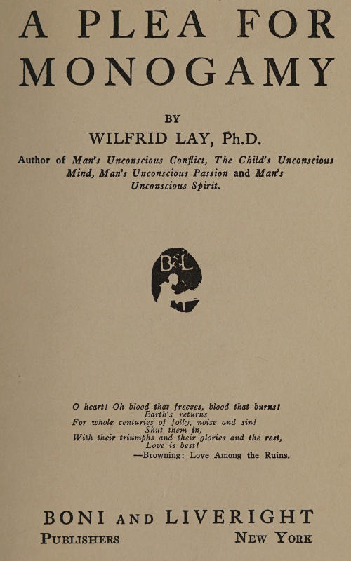 The Project Gutenberg EBook of A Plea for Monogamy, by Wilfrid Lay This eBook is for the use of anyone anywhere in the United States and most other parts of the world at no cost and with almost no restrictions whatsoever. You may copy it, give it away or re-use it under the terms of the Project Gutenberg License included with this eBook or online at www.gutenberg.org. If you are not located in the United States, you'll have to check the laws of the country where you are located before using this ebook. Title: A Plea for Monogamy Author: Wilfrid Lay Release Date: September 18, 2019 [EBook #60320] Language: English Character set encoding: UTF-8 *** START OF THIS PROJECT GUTENBERG EBOOK A PLEA FOR MONOGAMY *** Produced by Tim Lindell and the Online Distributed Proofreading Team at http://www.pgdp.net (This file was produced from images generously made available by The Internet Archive/American Libraries.)