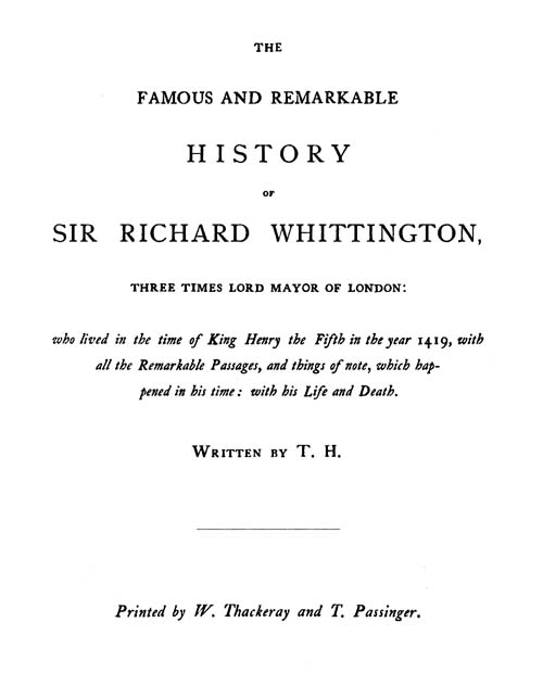 The popular story of Whittington and his Cat is one in which a version of a wide-spread folk-tale has been grafted upon the history of the life of an historical character, and in the later versions the historical incidents have been more and more eliminated. The three chief points in the chap-book story are, 1, the poor parentage of the hero; 2, his change of mind at Highgate Hill by reason of hearing Bow Bells; and, 3, his good fortune arising from the sale of his cat. Now these are all equally untrue as referring to the historical Whittington, and the second is apparently an invention of the eighteenth century. When the Rev. Canon Lysons wrote his interesting and valuable work entitled The Model Merchant he showed the incorrectness of the first point by tracing out Whittington’s distinguished pedigree, but he was loath to dispute the other two. It is rather strange that neither Mr. Lysons nor Messrs. Besant and Rice appear to have seen the work which I now present to my readers, which is the earliest form of the life of Whittington known to exist. This is[ii] printed from the copy in the Pepysian Library, a later edition of which, with a few typographical alterations, will be found in the British Museum library. This History will be found to differ very considerably from the later and better-known story, which appears to have been written early in the eighteenth century. A comparison between the latter which I print at the end of this Preface (p. xxix.) with T. H.’s earlier text will not, I think, be found unprofitable. The Famous and Remarkable History here reprinted is undated, but was probably published about 1670; the later edition in the British Museum is dated 1678. One passage on page 7—“The merchant went then to the Exchange, which was then in Lumber-street, about his affairs”—seems to show that it was originally written quite early in the century, and it is just possible that T. H. stands for the voluminous playwright and pamphleteer Thomas Heywood. The Exchange was removed to its present site in 1568, and therefore our tract could not have been written before that date, but must have appeared when the memory of the old meeting-place was still fresh in public memory. On page 11 it will be seen that Whittington, when discontented with his position in Fitzwarren’s house, set out before day-break on All Hallows-day with his clothes in a bundle, in order to seek his fortune elsewhere. He had only got as far as Bunhill when he heard Bow bells ring out what appeared to be—