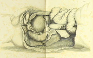 Thirdly. The section of the prostate is made in a direction most unfavourable to the extraction of a calculus. Instead of the free incision made through the depending lobe of the gland by Cheselden, the Gorget merely slices off the upper[18] and narrowest part, leaving the body of the gland, which affords so much resistance to a stone, untouched. This slicing of the gland never affords room enough for a large calculus to pass, and, in the violent efforts to extract it, either the bladder is torn laterally, or, what is worse, the prostate is dragged towards the external wound, and its ligamento cellular connexion with the arch and ramus of the pubes destroyed. When the operation is properly performed, that is, when the wound in the prostate is sufficient for the passage of the calculus, the connexion between the prostate and the arch of the pubes remains; and affords an opposing barrier, when the finger is attempted to be thrust upwards by the side of the bladder. The consequences attending the destruction of the attachment of the prostate are worthy of consideration.