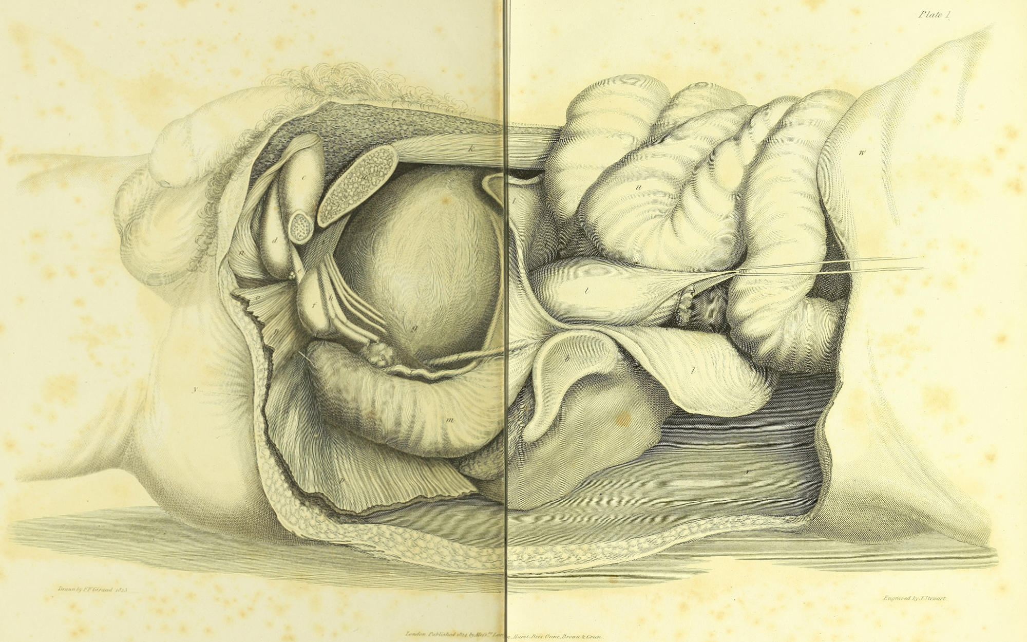In a person prepared for the operation the rectum is emptied by purgative medicine and an enema; and the bladder, which in a stone patient seldom contains more than eight ounces of urine, occupies the hollow of the flaccid or contracted rectum. Care has been taken not to distort these parts by the introduction of an instrument into the urethra, nor by more distention than was sufficient to preserve a general outline. To Mr. Giraud, dresser to Sir Astley Cooper, I am indebted for the drawings; the object of this plate being to represent the true bearing of the parts concerned in Lithotomy, they were drawn of the natural size, by measurement, from a young man, twenty-nine years of age, who died after six days illness; and the dissection being completed within twelve hours after his decease, the rigidity of death still remaining retained the parts in situ.