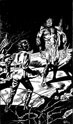 He ran. Miles he ran. His powerful, earthly muscles lending magic powers to his feet. Across broken, rock-hard plains—stumbling, falling, slipping, across stretches of mountain region and through dim valleys. And night descended upon him. Unfailing, relentless, it settled leaving everything pitch dark. And they followed him. Miles behind, but never giving up, never faltering. A mad man they followed who did not run, but leaped, fifty feet into the air, and screaming at his slow rate of descent barely touched the ground before he was off on another leap, even greater than the preceding one. A dozen times he was speared upon dangerous rocks—the tough substance of his suit the only thing between him and death. And as tiny leaks formed in his suit, the insidious cold crept in slowly, surely, numbing his body until each leap was a little shorter, a little less powerful than the other. Until lost in a maze of bleak mountains he collapsed.