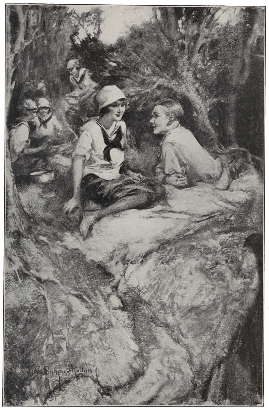 The girl, the dark-eyed girl whose nature was more woven of poetry than “pep”, who put morning songs into the heads of her flowers, continued to kneel “possessed”, upon a dew-silvered stone beside the rock garden, continued to stare, bewitched, at the dusky green of the early wood.