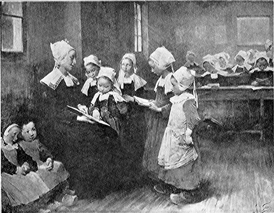 13Why are they not in class? How are they dressed? Why do they not wear bonnets like the older girls? What are the children at the desks doing? Which one in class is not listening? How many windows can you see? What makes you think there must be other windows? What can you see on the walls?