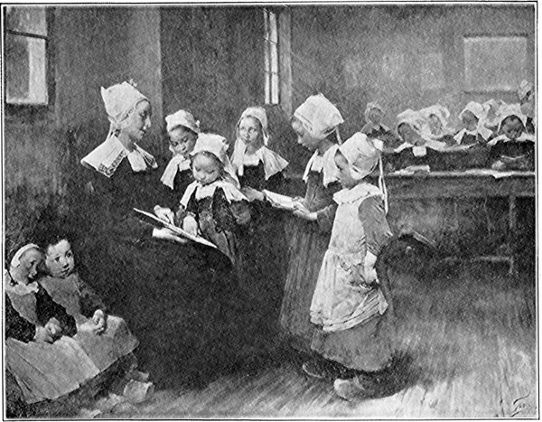 The story of the picture. In a little village in Brittany, France, there is just such a school as the one we see in this picture. We know this is true because the artist, Mr. Jean Geoffroy, lives near it and has told us all about it with his brush and paints. We are told, too, that he visits this school very often and has made friends with all the boys and girls. He is a very rich, generous man and besides painting their pictures as large as life, he gives them flowers, cakes, and candy. Although he is naturally a very shy, quiet man, the children never find him so when he is entertaining them.