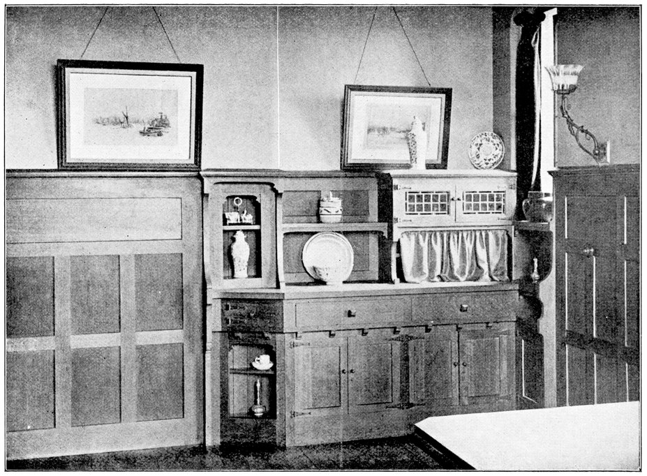 A further cause of failure in decorating and furnishing is virtually the same as we noticed when speaking of planning. When a small middle class house is wanted, what is usually done, we saw, is virtually to take a plan suitable for a larger house and reduce it every way, instead of designing a house suited to the new requirements. This same mistake is generally made in the decoration and furniture; instead of these being designed to suit the condition or circumstances in which they are to be placed, each designed for its position and purpose, and good and honest as far as it goes, what do we find? Cheapened imitations of the sort of thing common in the larger house, cheapened12 by being badly made, by veneer on pine instead of solid wood, by cast metals and ornament made to look like wrought, by machine carved wood, by marbled slate, &c. P. G. Hubert in his little book entitled “Liberty and a Living,” says: “One of my critics, for whom I have great personal deference, tells me that my theory of life tends to a relapse into barbarism, and in illustration of the truth of his position, he pointed one evening to a music stand near the piano with the remark: “With your ideas, that stand would never be made of mahogany and elaborately ornamented, but would be of pine, perhaps stained.”