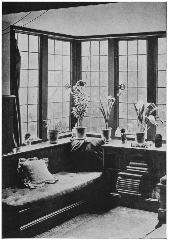 And now for the last cause of failure of which I shall speak, and this is: the very marked feeling which everything has of not having been designed for its place: the look everything has of being ready to move at any moment. Most things to look right and happy in their places must be designed for their places. The advantages attaching to a room furnished in this way, and largely by means of fixtures, I think the accompanying sketches will do something to illustrate.