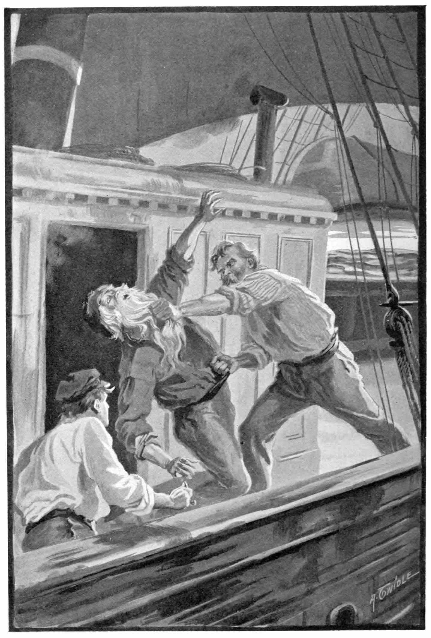 The wind now dropped, in one of its wayward moods, until the rapid rush past of the Mirzapore faltered almost to a standstill, and the two vessels, scarcely a mile apart, rolled easily on the following sea, as if in leisurely contemplation of each other. All the Mirzapore’s passengers, a hundred and twenty of them, clustered along the starboard poop-rail, unfeignedly glad of this break in what they considered the long monotony of a sailing passage from London to the colonies. And these seafarers of fifty-five days, eagerly catching their cues from the officers, discussed, in all the hauteur of amateur criticism, the various short-comings of the homely old tub abeam. Gradually the two vessels drew nearer by that mysterious impulse common to idly-floating things. As the different details of the old ship’s deck became more clearly definable, the chorus of criticism increased, until one sprightly young thing of about forty, who was going out husband-seeking, said—
