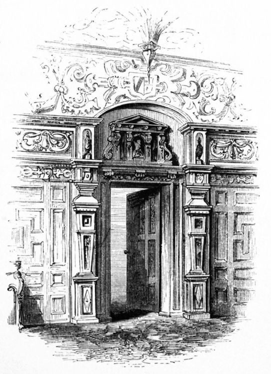on the same side.[1] The wainscotting has been stained to imitate walnut-wood. The walls are adorned by several finely-painted portraits. Of the rooms on the upper floor there are none that demand especial notice: two of the bed-chambers are, however, hung with faded tapestry, concealing doors that lead to remote parts of the building. The antique damask bed-furniture and quilted coverlets are relics of ages long passed away. The Gallery, hung with old family portraits, extends nearly the whole depth of the mansion—being upwards of one hundred feet long by about eighteen wide, with oak{11} panels to the ceiling. A door-way in the court-yard conducts to a neat chapel, containing a window of stained glass, and an altar of fine Egyptian marble, inlaid with lapis lazuli. The venerable edifice
