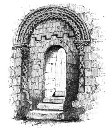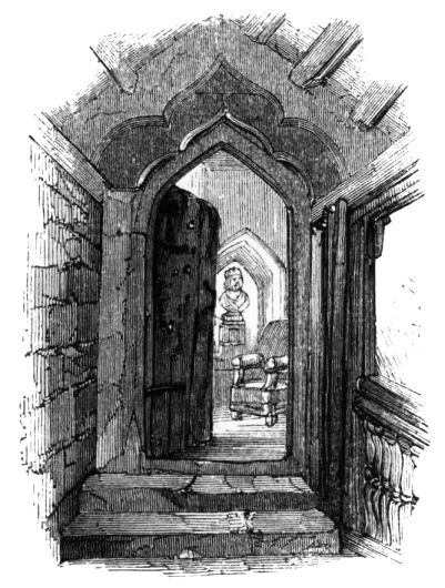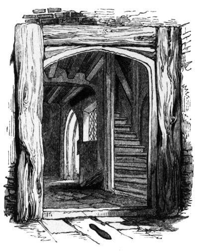is by a low door-way, underneath a porch, leading into a spacious hall,