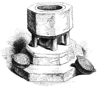 The village of Sawston stands in the hundred of Whittlesford, and deanery of Camps. There are four manors in this parish—Pyrotts, Dernford, Dale, and Huntington—all now the property of Mr. Huddleston. The manor of Pyrotts continued until the year 1329 in the immediate descendants of Pirotus, who held it under Eudo Fitzherbert, Steward of the Household to William the Conqueror. Sir Edmund de la Pole died, seised of this manor and Dernford, in 1419. Mr. Huddleston’s ancestor came into possession of them—which had descended from the De la Poles through the Ingeldesthorps to the noble family of Neville—by his marriage with the daughter of the Marquis Montagu. The manors of Dale and Huntington were purchased by Sir Edmund Huddleston before the year 1580; the manor of Dale, or Le Dale, had been in the Saliston, or Sawston, family, who held it under the manor of Pyrotts by the service of finding an armed soldier whenever the owner of that manor should attend the King to the wars. Near the entrance to the park, there formerly stood an ancient cross, the shaft and pedestal of which alone remain. It forms the subject of our initial letter.