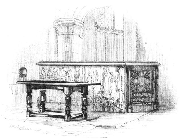 The church of Sawston, which abuts on the park, appears to have been built about the thirteenth century; like most of the churches of Cambridgeshire, it possesses a fine open porch. Sir John Huddleston, who spent the greater part of his fortune in the service of Philip of Spain after Mary’s death, lies buried in the chancel here. The following inscription is engraved on a brass plate placed on the tomb, represented in the annexed woodcut.
