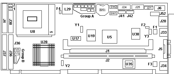 —the SBC automatically adjusts the processor core-voltage during POST – Pentium up to 200 MHz – Pentium with MMX up to 233 MHz – AMD K6-2 or K6-3 up to 500 MHz DIMMs Min 32MB, max 384MB. The SBC has two 168-pin DIMM sockets (bank 0 and bank 1). Each socket can accept gold-tabbed, non-parity, synchronous-DRAM DIMMs. The DIMMs can be 32 MB, 64 MB, 128 MB, or 256 MB.The DIMMs do not have to be the same size; the SBC will optimize for the maximum performance of each DIMM. NOTE: Max RAM is (1) 128MB DIMM and (1) 256MB DIMM. 47L2707 32 MB DIMM, 10-ns, non-parity, gold tab 47L2708 64 MB DIMM, 10-ns, non-parity, gold tab 47L2709 128 MB DIMM, 10-ns, non-parity, gold tab 47L2744 256 MB DIMM, 10-ns, non-parity, gold tab L2 Cache The SBC has a 512 KB level-2 (L2) cache, which cannot be upgraded. Group A Connectors ![]() J12, J7 Power-On LED The power-LED connector turns on the system power-on indicator (the green LED) whenever 5 volts is applied to the SBC. It consists of two 2-pin connectors operating as a single connector. The connector pair supports the 2-pin LED connector in IBM systems and the 3-pin LED connector in industry-standard covers. The 2-pin power LED can be connected to J12 or J7. The 3-pin power LED can be connected across J12-1 and J7-1, or across J12-2 and J7-2. ![]()