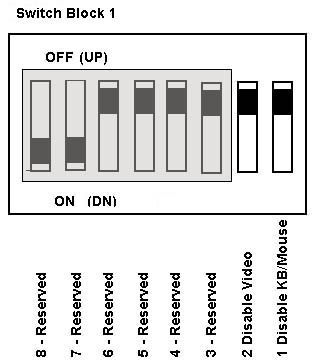 The logic on the SBC works as follows: The two connector pins on the SBC are routed to the detector circuitry. When the pins are shorted, an event is latched in the detector. The event is latched even if the computer is turned off or the power cord is unplugged. Bit 6 at I/O address 0158h contains the status of the latch. If bit 6 is 1, the latch has been tripped. The latch is reset by setting bit 6 at I/O address 0157h to 1. To use the logic to detect a cover being removed, the user must connect a switch that is closed when the cover is removed, and open when the cover is installed. Clear Password Removing a Power-on or System Administrator Password: If you need to remove either the power-on or system-administrator password: 1. Turn off the computer and remove the cover. 2. Use a screwdriver or other conductive device to short the two pads on the password clear pad for 10 seconds (refer to the following illustration). An alternative method is to remove the battery for 10 minutes. ![]() 3. Reinstall the cover. 4. Turn on the computer and run the Configuration/Setup Utility program. 5. If a password is required, you must enter a new one. Switch Block 1 ![]() 8 - 3 Reserved Leave these alone. 2 Disable Video Switch 2 on switch block 1 lets you disable the video function on the SBC. When this switch is down (on), the SBC disables all video drivers on the SBC. Default is video enabled (off). Disable Keyboard/Mouse Switch 1 on switch block 1 is used to disable the keyboard and mouse ports, preventing anyone from using the keyboard or mouse. Default position is keyboard and mouse ports enabled (off). Switch Block 2 ![]() 8 Enable Auto Boot Switch 8 on switch block 2 controls the SBC auto-boot feature at power-on. With auto boot enabled, BIOS detects configuration errors at power-on and automatically alters the CMOS settings to match the hardware so that the computer can complete the boot process without operator intervention. This is useful where an operator or keyboard and display are not available to clear the configuration error. Use this carefully because it can mask hardware problems. Hardware errors could cause the computer to change configuration and possibly lead to inconsistencies in the operation of hardware and applications running on the computer. Default position is auto boot disabled (off). 4 RS-422/485 or RS-232 Switch 4 on switch block 2 controls the electrical interface of serial port B. If the switch is up (off), the port is a standard RS-422/485 interface. If the switch is down (on), the port is a standard RS-232 interface. The default position is RS-232 (on). Processor Speed Selection Switches Switch block 2 is used to configure the SBC to the speed of the microprocessor. Switches 1 through 3 select the internal clock multiplier for the microprocessor. Switches 5 through 7 select the input frequency and external bus speed. The following table shows the settings for the clock multiplier and the resulting internal processor clock for each CPU-input frequencies.