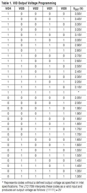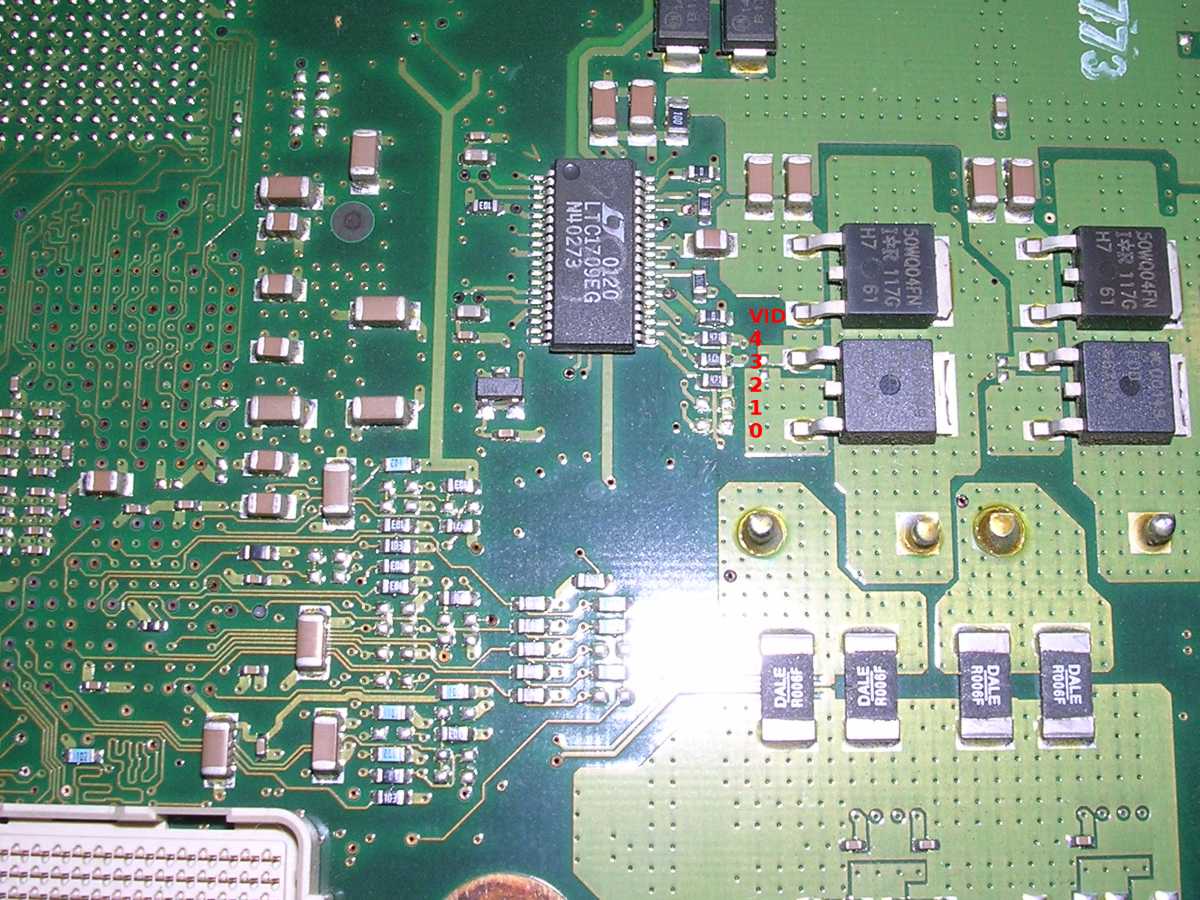 Overclocking instruction has been shown here, but it is for a different CPU board, available in other units but not this one. My CPU board is another one, with different circuits, a bit like in 2002 Macs (overclocking here), but with 2001 CPU. Instead of 4 frequency resistors, there are 5, and it looks like the CPU works seriously overvolted -  LTC1709 voltage regulator is set to 2.7V! I checked the MOSFET voltage and indeed it's 2.7V. VID resistors are shown on the right (resistor present is 0, absent is 1) and the voltages are shown in the table from datasheet, but I haven't figured the CPU frequency jumpers out.