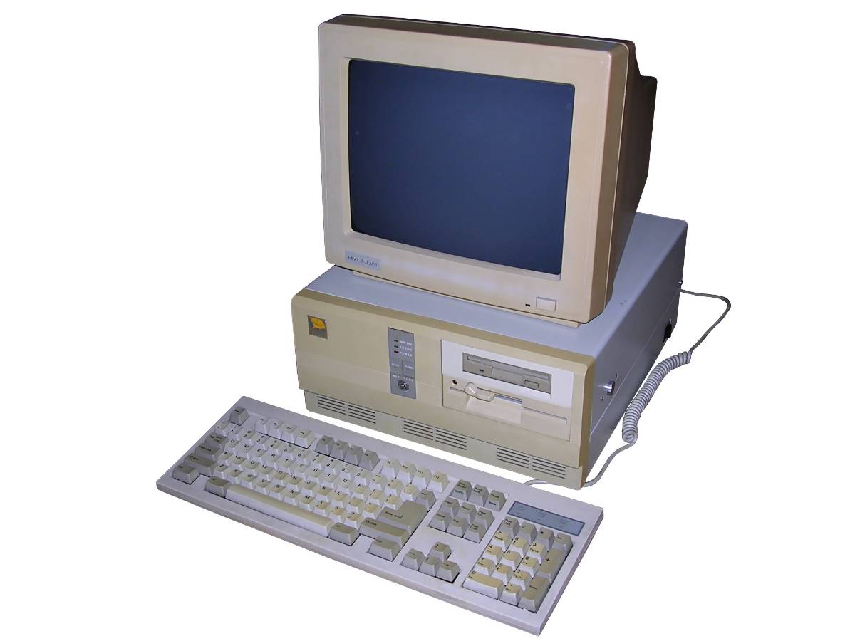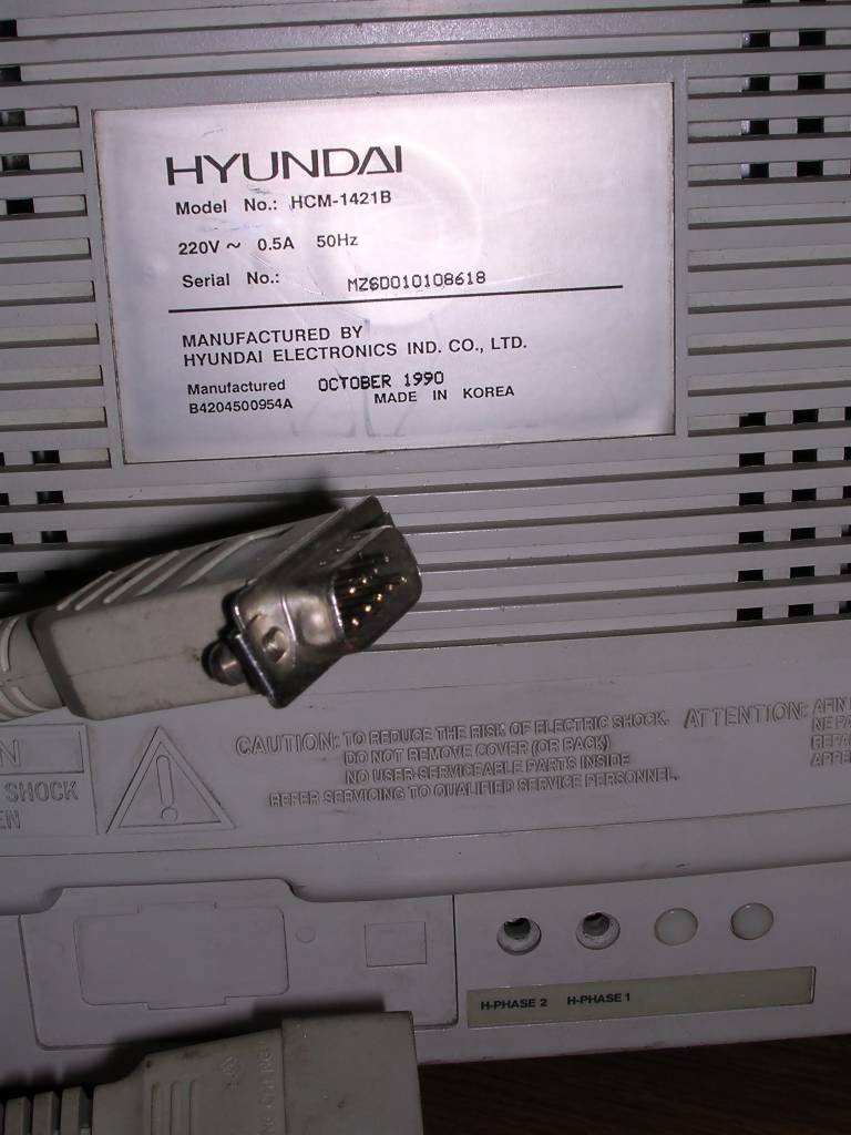 A colour CGA monitor for colour boards, one of the last. This time branded "Hyundai", as many of these lines, with 14-inch nice CRT. Although Korean or Taiwanese, this unit is based on Samsung CRT and Japanese circuits. One more thing: This unit is quite heavy as for early 1990s CRT.