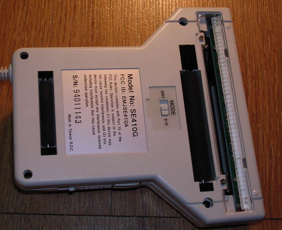 | Information: A typical early-1990s handheld scanner, with 400dpi maximum resolution. Although technically it's 4-bit grayscale (16 levels), it's usually classified as monochrome. Its LED illumination is green, so it's not so good with non-contrasting colours in documents. It is connected by ISA board and is supplied with own DR.GENIUS software for scanning and image processing. Some versions were supplied with OCR program. Everything packed in a nice portable box. It works under DOS, but there is an old Linux driver which requires some significant work to run in modern distributions... if modern distributions can run on ISA-based systems.