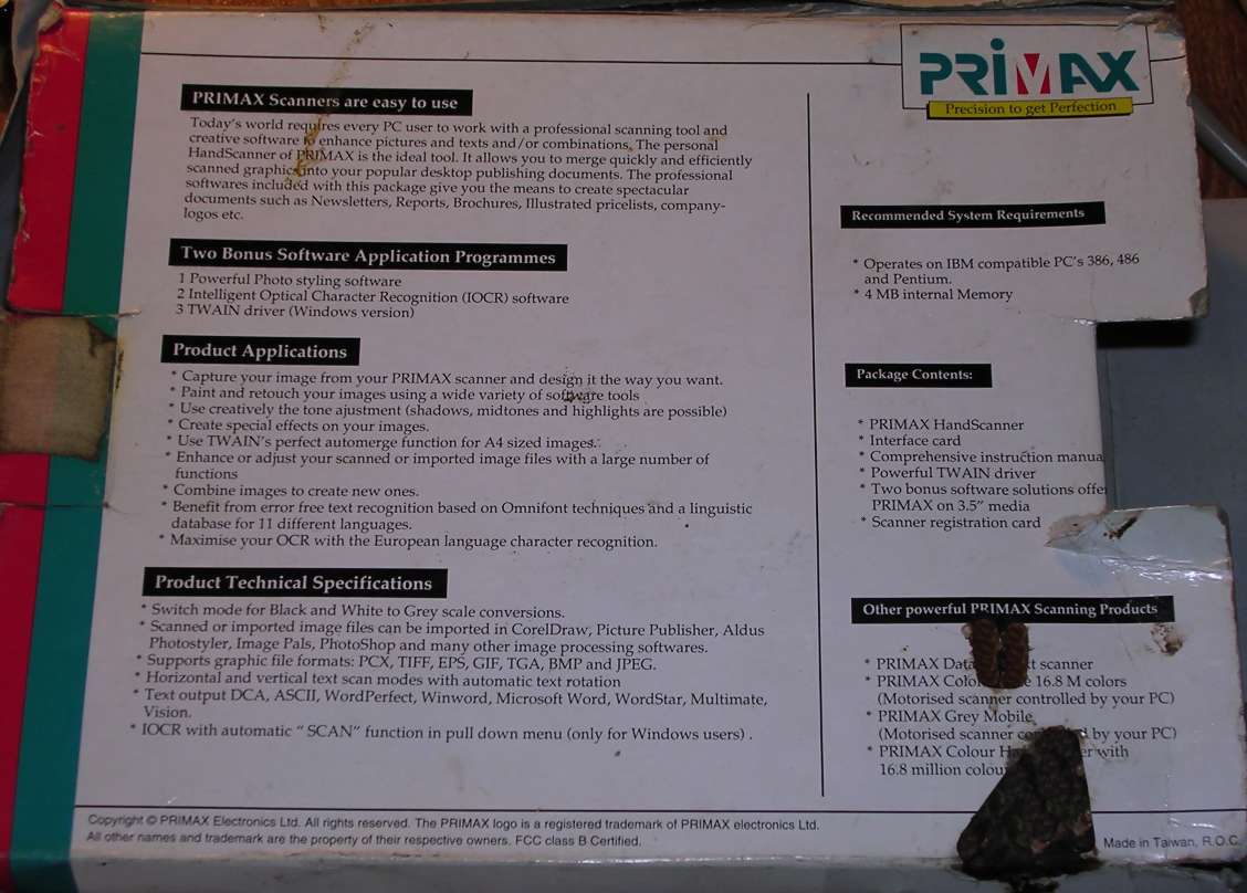 | Information: Another 400dpi handheld scanned from mid-1990s. This time it's a full 8-bit grayscale. Also connected with proprietary ISA board. This scanner had a Windows TWAIN driver, FinishingTouch image manipulation program and ReadIRIS OCR (for some unknown reasons my unit has only one ReadIRIS disk - second was lost?).
