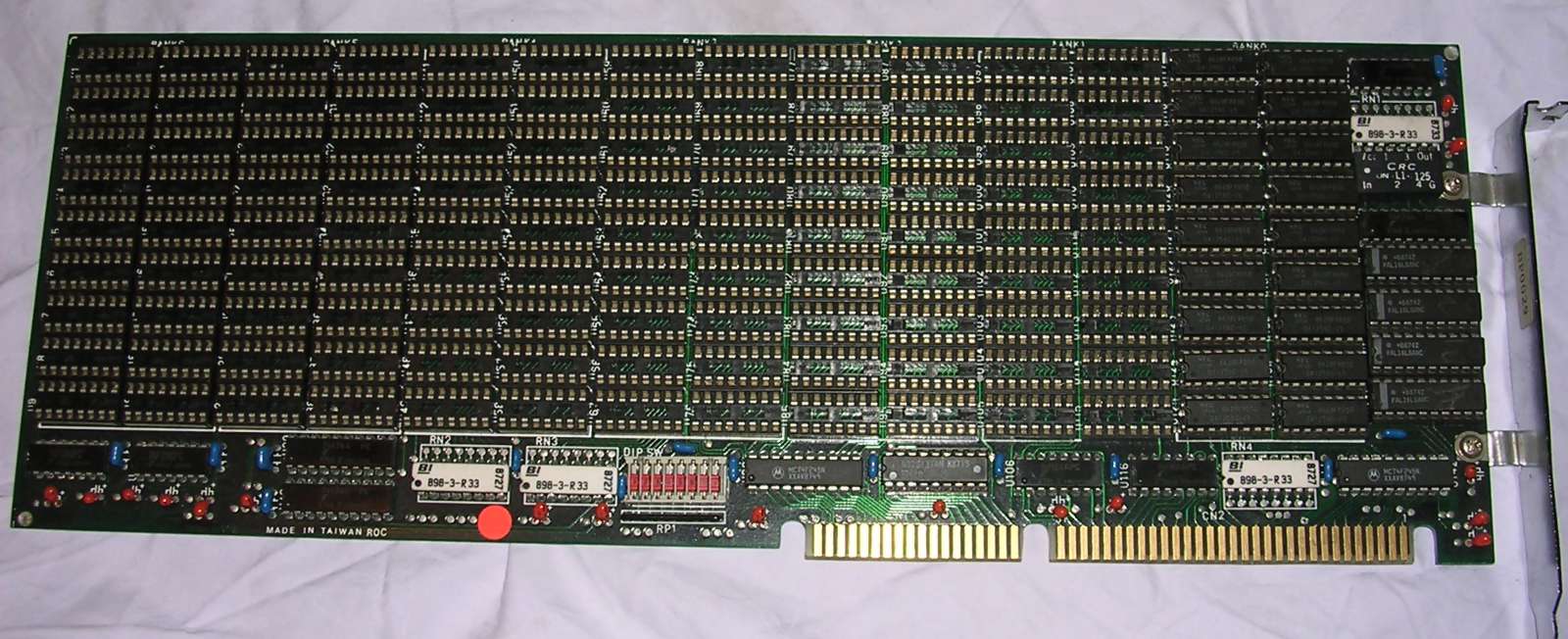 And this is probably an XMS board for 286 which cannot fit more RAM - a MC-M410 is a 16-bit ISA board whose banks can be filled with 256Kx1 chips. The logic is made on PAL chips and, if fully packed, this board can expand PC by 3.5MB of RAM. In 286 computers, only later boards had expansion to 4MB, while early, cheap mainboards kept the limit to 1MB. Unfortunately I don't have settings for it and presence of PAL chips make it hard to figure them out. The board was found with only 512K of RAM installed in bank 0.