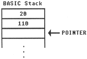 Line 20-This line terminates execution with the END statement. The stack is back to its original condition, with the pointer indicating the first stack location. The line numbers are still in the stack itself, but since the stack pointer no longer points to them, they are no longer active. They will be wiped out by new stack entries.