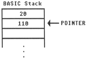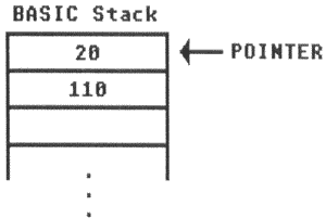 Line 10-GOSUB to Line 100 is executed. First, the computer finds the next statement after GOSUB. The next statement is in Line 20, so the computer pushes that line number onto the first location on the stack, and changes the stack pointer to point to the next available location. Execution then proceeds at Line 100. At this point, the stack looks like: