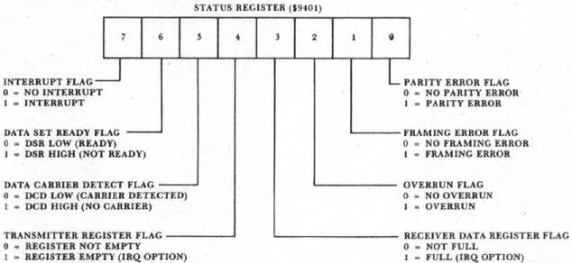 For the simple experiments described here the status register bits of most interest are the transmitter register flag and the receiver register flag. Writing to the transmitter register clears the register flag, and one should not write data to this register again until the data in the transmitter register has been transformed into a serial bit stream and has been transmitted by way of the T×D pin. When the word has been transmitted, bit four goes to logic one, and the transmitter data register is ready to accept another word. Likewise, when a complete word has been received by way of the R×D pin and the word is in the receiver data register, then bit three of the status register goes to logic one, and the word is ready to be read from the 6551. Both of the events just described may be used to produce interrupt requests (